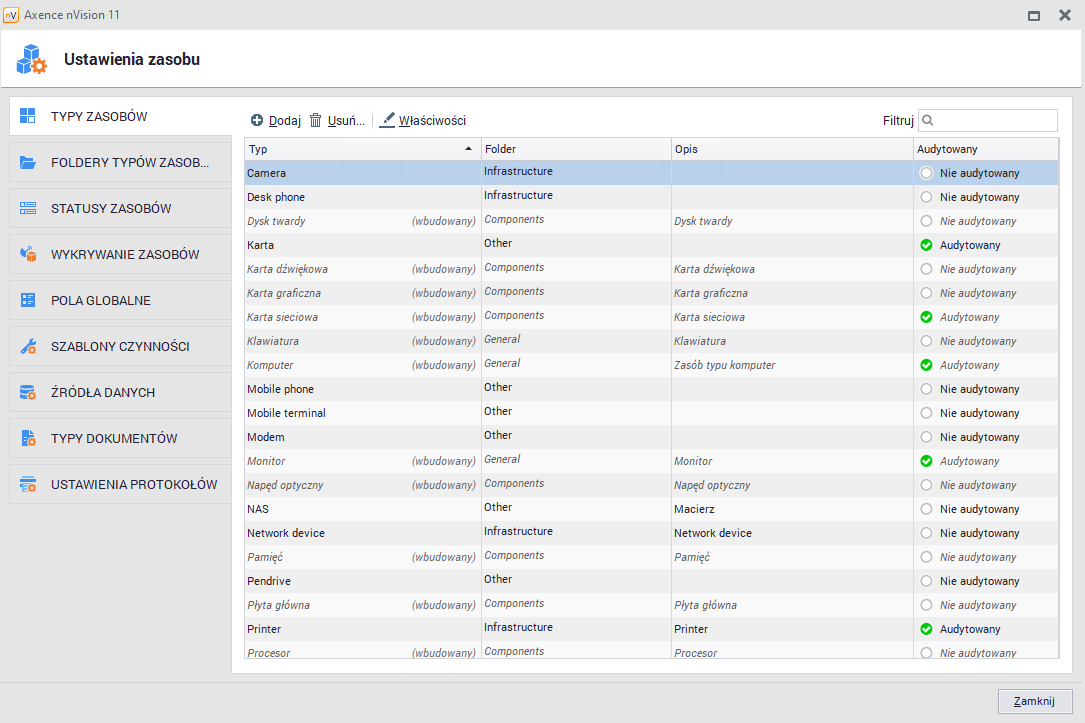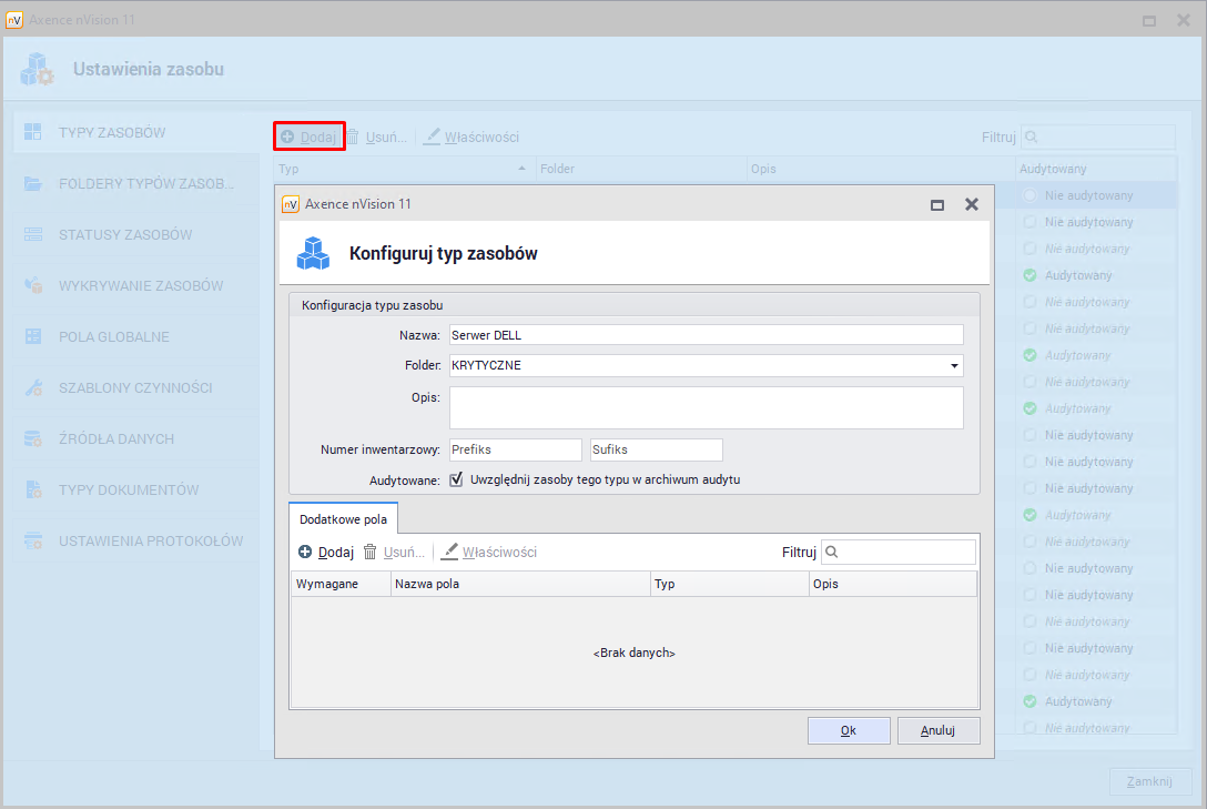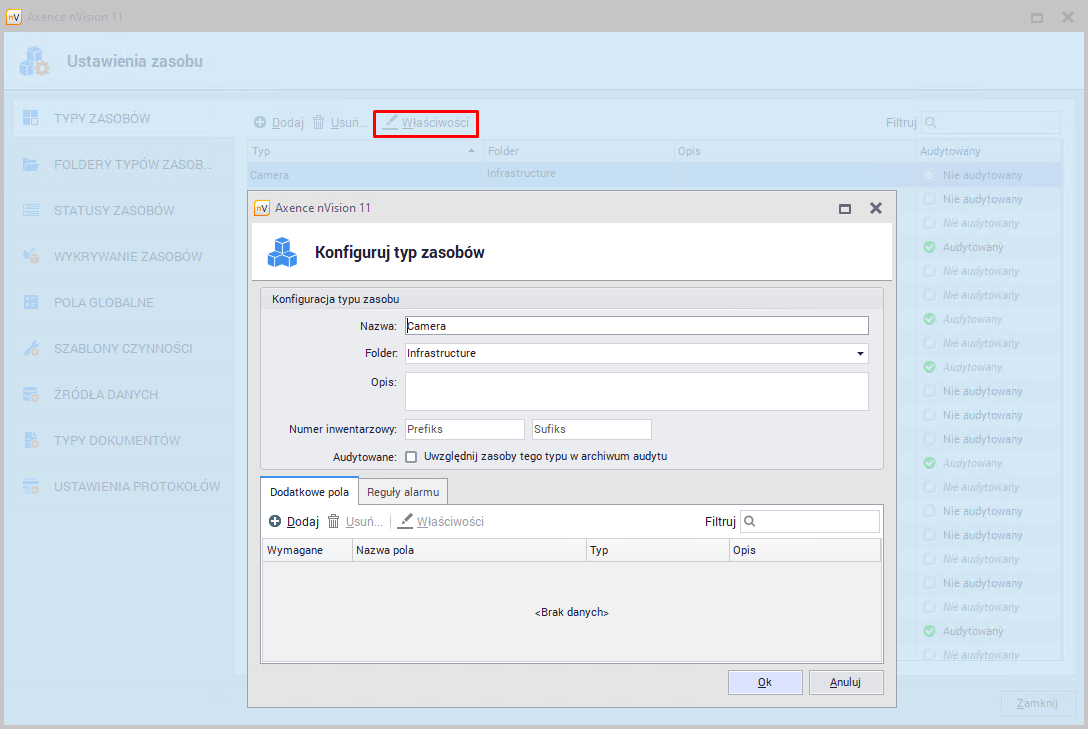 Każdy typ zasobu zawiera następujące właściwości: •Nazwa - nazwa typu, •Folder - folder, w którym typ ma się znajdować, •Numer inwentarzowy - określenie prefiksu i sufiksu dla wybranego typu, •Audytowane - określenie czy zasoby tego typu mają się znaleźć w archiwum audytu