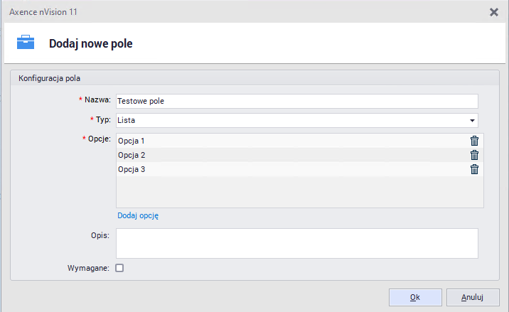 Następnie należy wypełnić pola konfiguracyjne - polami wymaganymi są "Nazwa" i "Folder". Można również dodać dodatkowe pola dla tworzonego typu zasobu. Po zakończeniu konfiguracji należy zatwierdzić ustawienia przyciskiem OK.
