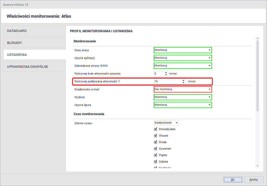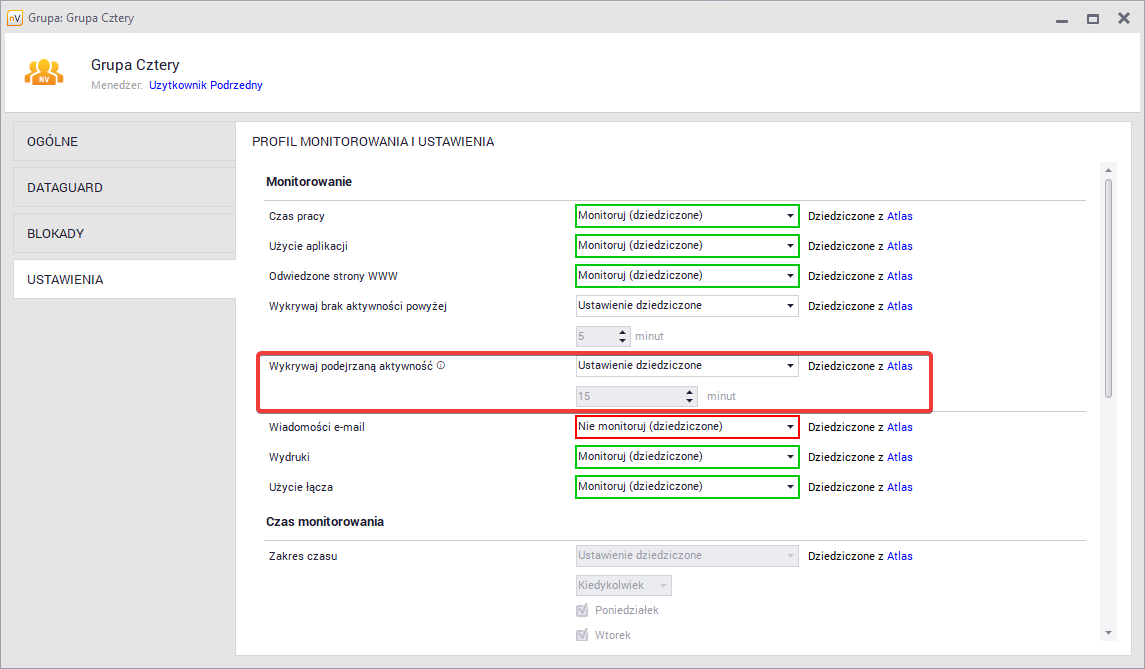 Ustawienia dotyczące wykrywania podejrzanej aktywności działają na trzech poziomach: 1. Atlasu 2. Grupy 3. Konkretnego użytkownika Ustawienia są dziedziczone.