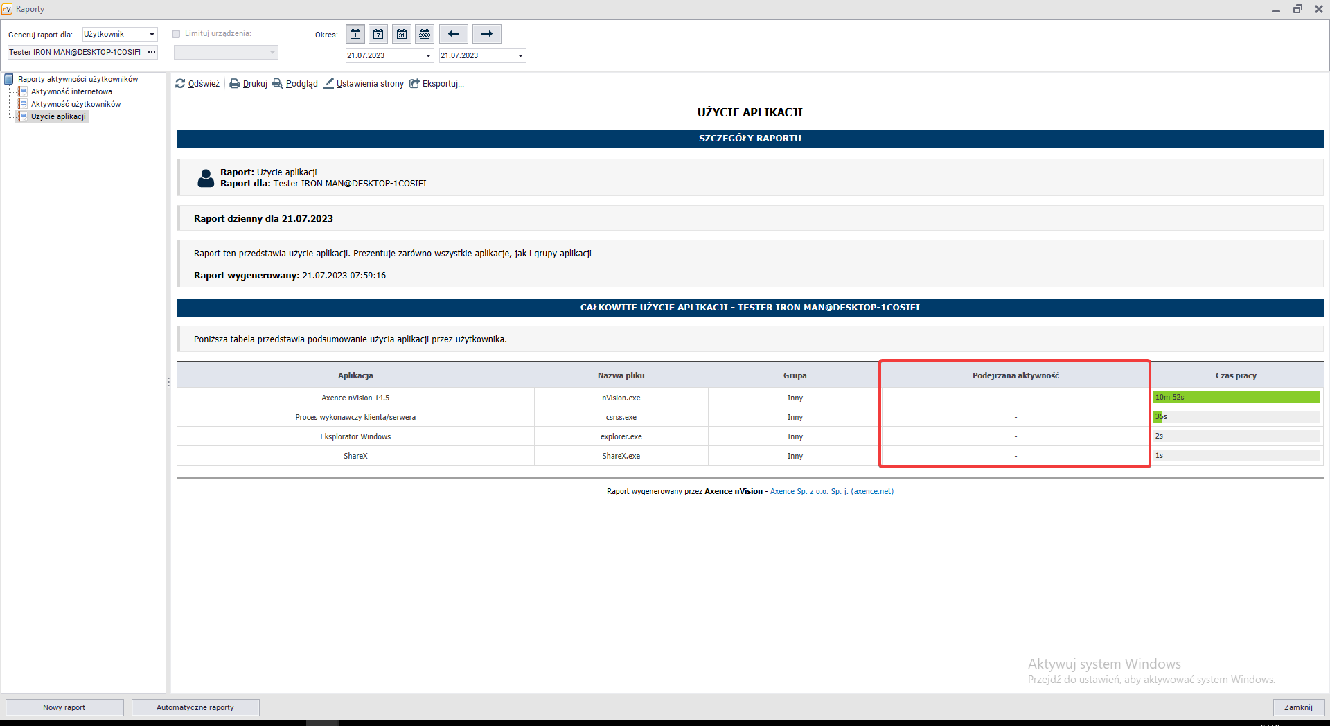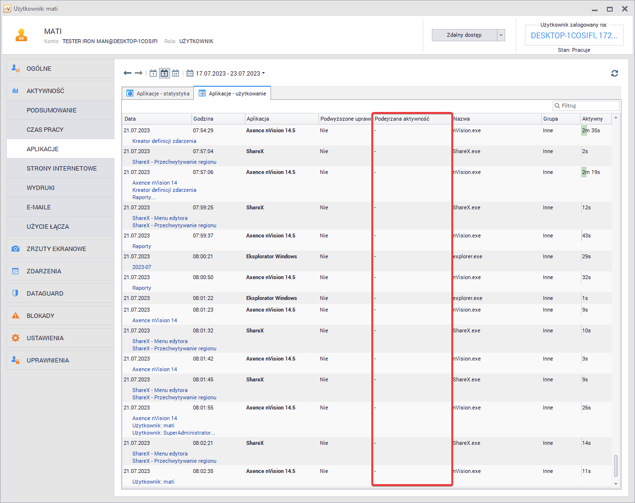 Podejrzaną aktywność można podejrzeć w widoku UserInfo, w zakładce Aplikacje - Aplikacje-użytkowanie. Jeżeli podejrzana aktywność zostanie wykryta, to informacje na jej temat będą widoczne w kolumnie podejrzana aktywność.