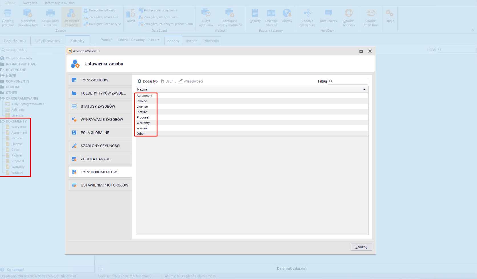 Funkcjonalność dokumentów pozwala na powiązanie załącznika (pliku) z zasobem. Administrator może dowolnie dodawać, edytować i usuwać typy dokumentów. Typy dokumentów pozwalają na dokładniejszą kategoryzację dokumentów dodanych do bazy danych programu. W oknie Zasoby dostępnym z poziomu głównego okna nVision możliwe jest wyświetlenie dokumentów wybranego typu.