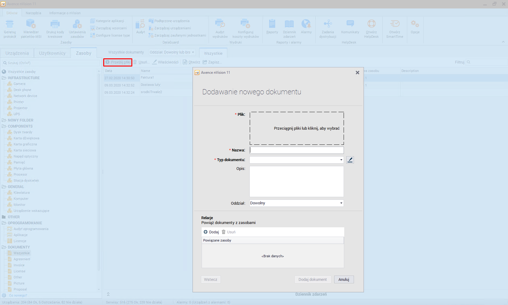 Inny sposób dodawania dokumentów Dokumenty można również dodawać wykorzystując zakładkę "Zasoby" widoczną w głównym oknie nVision. Na dole listy w sekcji dokumentów po kliknięciu przycisku Prześlij pliki zostanie otwarte okno dodawania nowego dokumentu: