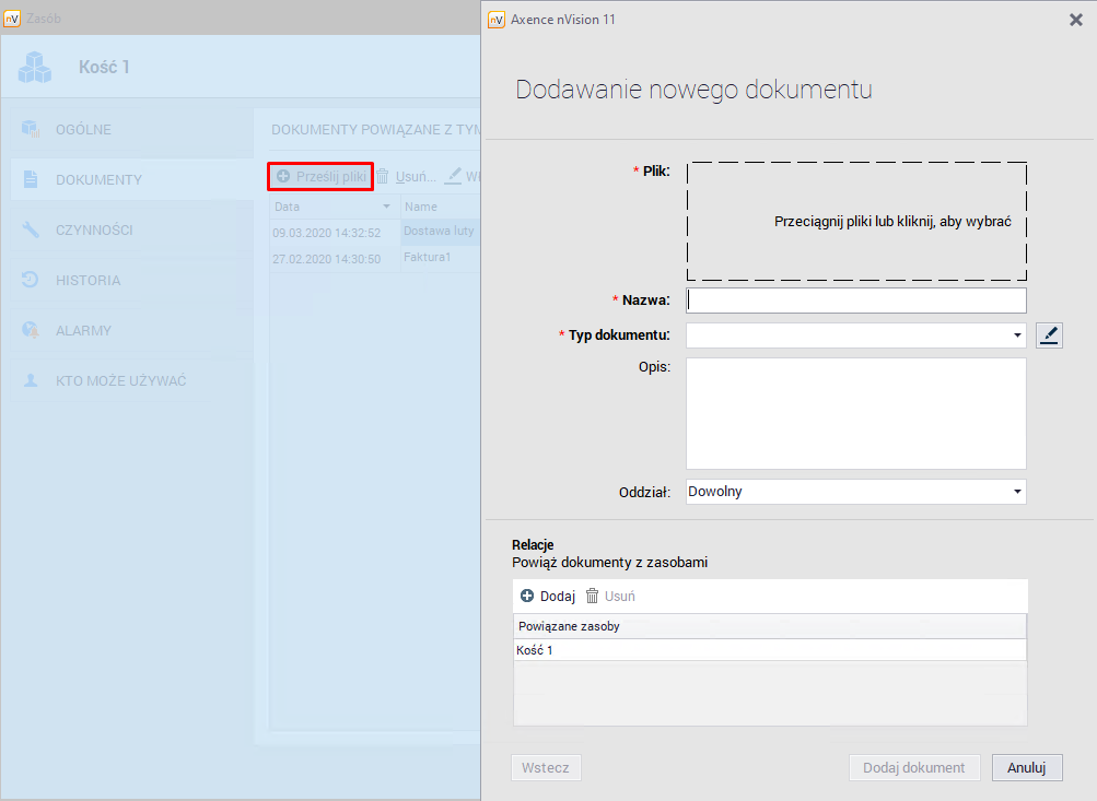Informacje o dokumencie Pola wymagane do uzupełnienia zostały oznaczone symbolem ' * '. •Plik - należy wybrać lub przeciągnąć pliki w zaznaczone miejsce, •Nazwa - nazwa dokumentu widoczna w nVision, •Typ dokumentu - należy wybrać jedną pozycję z listy - dodawanie nowych typów dokumentów zostało opisane w osobnym rozdziale, •Opis - dodatkowe pole tekstowe opisujące dokument, •Oddział - dodatkowe pole z możliwością określenia oddziału. Relacje Aby powiązać dokument z zasobem, należy kliknąć przycisk Dodaj oraz wybrać z listy zasoby.