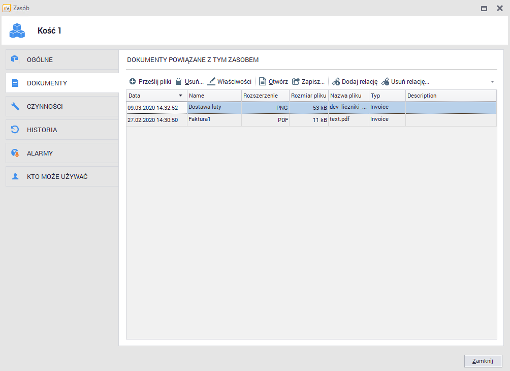 Zakładka dokumenty w oknie edycji zasobu pozwala na dodanie, wyświetlenie i usunięcie dokumentów powiązanych z wybranym zasobem. Dokumenty powiązane z wybranym zasobem będą widoczne w tabeli: