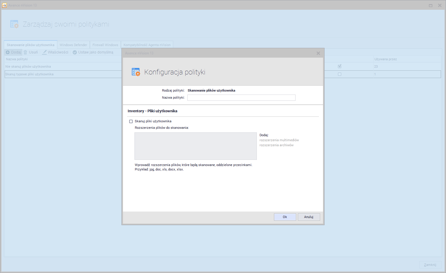 Skanowanie plików użytkownika jest jednym z rodzajów dostępnych do konfiguracji w konsoli nVision polityk. Polityka jest dostępna w module Inventory.