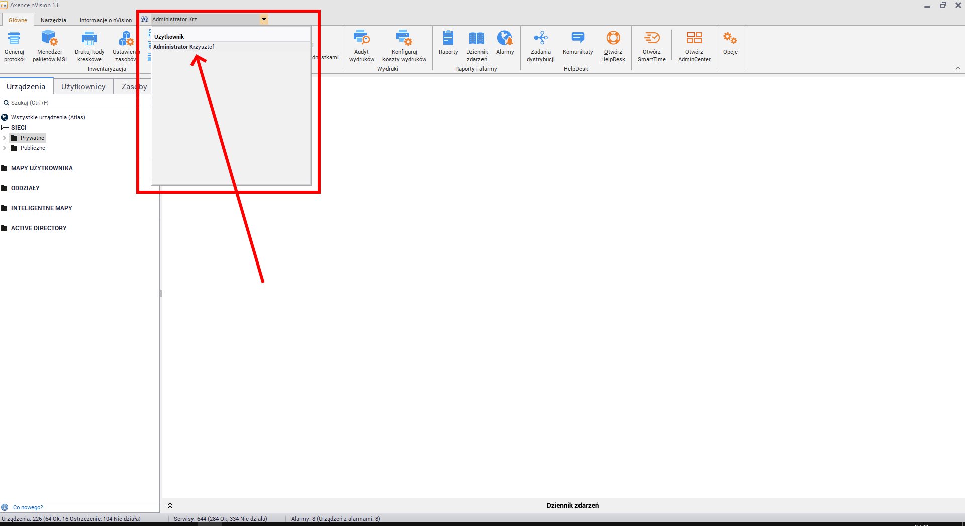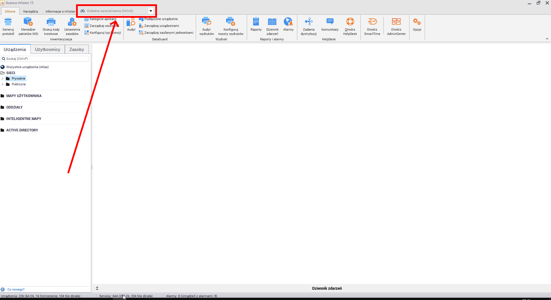 Wyszukiwanie konkretnej informacji spośród wielu zbiorów, takich jak np.: Użytkownicy, Zasoby, Mapy, Urządzenia, Dokumenty itd. było do tej pory dość uciążliwe, gdyż w celu odnalezienia danego obiektu należało najpierw przejść do okna z odpowiednią listą, a następnie ją przefiltrować. Powyższa niedogodność została wyeliminowana poprzez wprowadzenie globalnej wyszukiwarki, która służy do przeszukiwania wielu zbiorów w jednym miejscu. Globalna wyszukiwarka znajduje się w górnej części konsoli, powyżej wstążki. Globalna wyszukiwarka jest zawsze dostępna w głównym oknie konsoli nVision i na jej wyświetlanie nie ma wpływu aktualnie przeglądana zakładka.