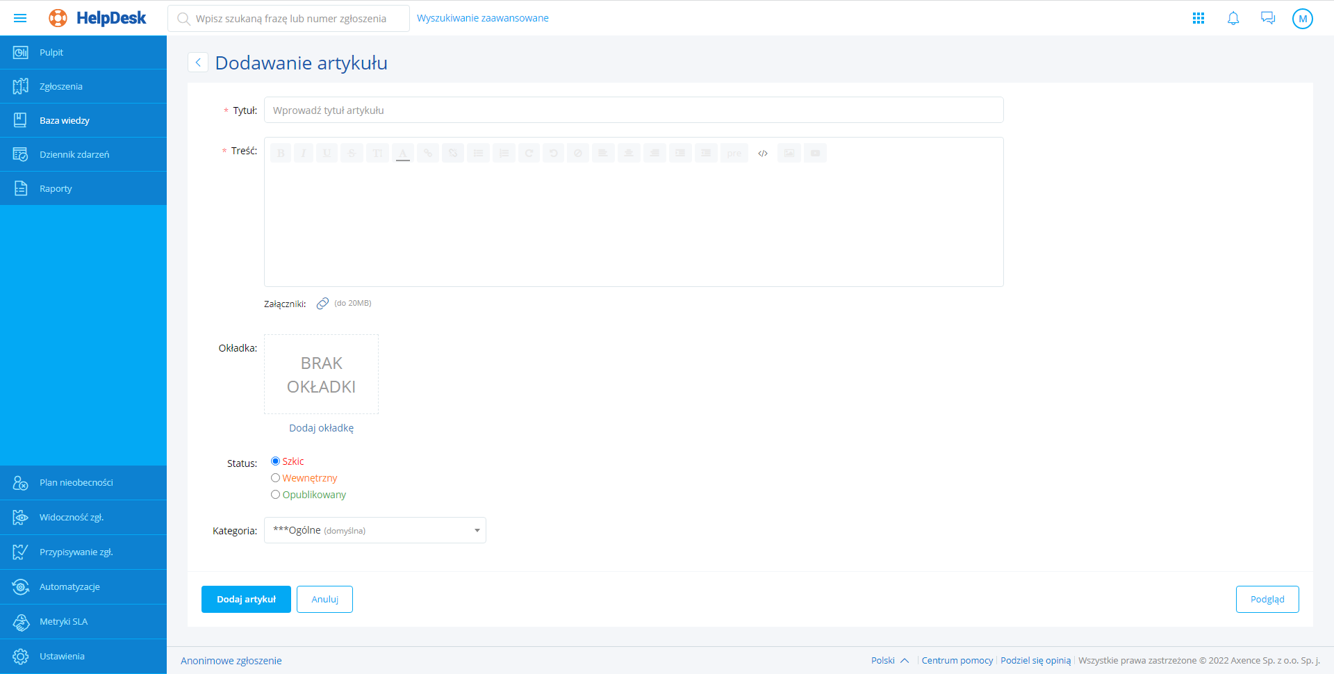 Aby utworzyć nowy artykuł w interfejsie HelpDesk należy: 1.W widoku Baza wiedzy kliknąć w przycisk Dodaj artykuł. 2.Dodać Okładkę artykułu (opcjonalnie). 3.Wpisać Tytuł artykułu. 4.Wpisać treść artykułu we wbudowanym edytorze tekstu. 5.Dołączyć do artykułu obrazek lub link do zewnętrznego filmu wideo, korzystając z opcji Prześlij obrazek i Wstaw film. 6.Ustawić Status artykułu jako Szkic lub Opublikowany (domyślnie: Szkic). Artykuły oznaczone jako szkic nie będą widoczne dla użytkowników końcowych. Artykuły ze statusem wewnętrzny będą widoczne tylko dla osób z rolą Administratora oraz pracownika HelpDesku. 7.Ustawić Kategorię artykułu, wybierając ją z listy dostępnych kategorii. Możesz dodać nową kategorię, nie przerywając tworzenia artykułu. 8.Można zobaczyć tworzony artykuł, klikając w Podgląd. Aby wrócić do okna edycji artykułu, kliknij w przycisk Powrót do edycji. 9.Po skończeniu tworzenia artykułu kliknąć w przycisk Dodaj artykuł.