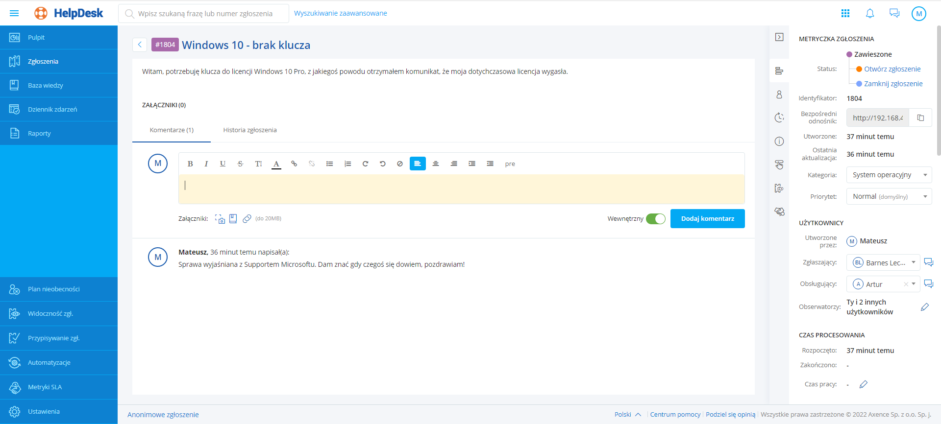 Aby dodać komentarz do zgłoszenia: 1.W widoku Zgłoszenia należy wybrać zgłoszenie z lity. 2.Wpisz komentarz we wbudowanym edytorze tekstu w polu poniżej opisu zgłoszenia. 3.Możesz dodać załącznik. 4.Możesz Dodać zrzut ekranowy, jeśli na urządzeniu zainstalowany jest Agent. 5.Domyślnie formularz ustawiony jest w trybie publikacji komentarzy wewnętrznych (pomarańczowe tło), które są widoczne tylko dla użytkowników typu administrator i HelpDesk. Jeśli komentarz ma być widoczny dla użytkowników końcowych (białe tło), odznacz pole Wewnętrzny. Użytkownik końcowy może dodawać tylko komentarze publiczne. 6.Możesz dodać link do artykułu z Bazy wiedzy (tylko administrator i pracownik pomocy HelpDesku). Aby to zrobić, kliknij w przycisk Wskaż artykuł i wpisz tytuł lub wybierz z listy artykuł, który chcesz podlinkować. Możesz w ten sposób podlinkować wiele artykułów. Aby zakończyć, kliknij w przycisk Wskaż artykuł. 7.Aby opublikować komentarz, kliknij w przycisk Komentarz. Powiązane tematy |