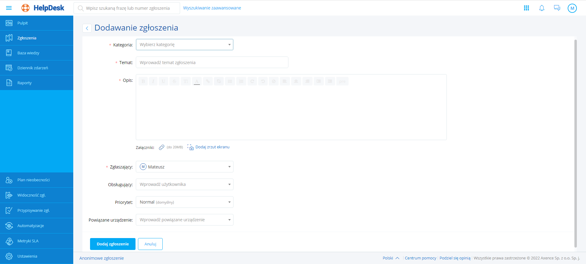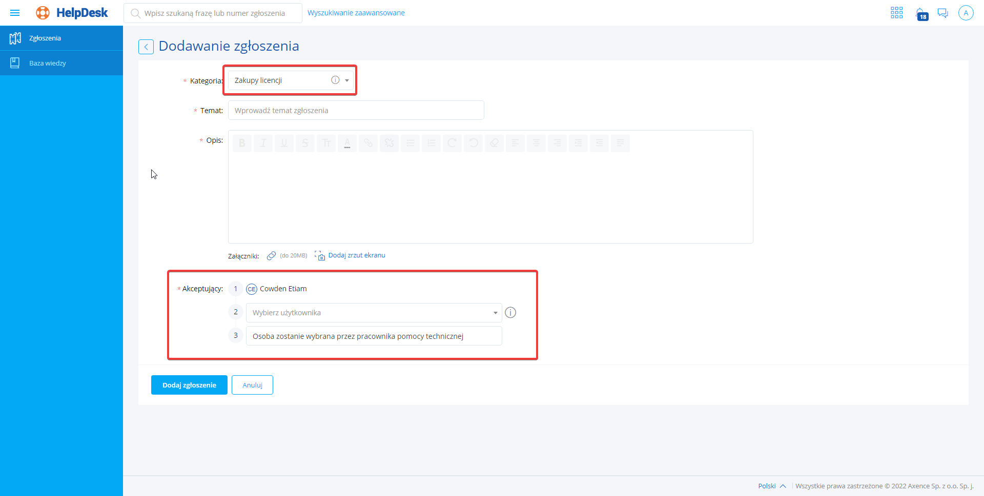 Aby utworzyć nowe zgłoszenie w interfejsie HelpDesk: 1.W widoku Zgłoszenia kliknij w przycisk Dodaj zgłoszenie. 2.Podaj Temat zgłoszenia. 3.Podaj Opis problemu we wbudowanym edytorze tekstu. 4.Możesz Dodać załącznik do zgłoszenia. 5.Możesz Dodać zrzut ekranowy, jeśli na urządzeniu zainstalowany jest Agent. 6.Uzupełnij pole Zgłaszającego (Administrator i Pracownik HelpDesku może utworzyć zgłoszenie w czyimś imieniu). 7.W polu Obsługujący wybierz z listy osobę, do której zostanie przypisane zgłoszenie (opcjonalnie). 8.Określ Kategorię zgłoszenia, wybierając z listy dostępnych kategorii. Możesz dodać nową kategorię, nie przerywając tworzenia artykułu. 9.Określ Priorytet zgłoszenia, wybierając z listy dostępnych priorytetów. Możesz dodać nowy priorytet, nie przerywając tworzenia artykułu. 10.Wybierz z listy Powiązane urządzenie, którego dotyczy zgłoszenie (opcjonalnie). 11.Po skończeniu tworzenia zgłoszenia kliknij w przycisk Dodaj zgłoszenie. Ścieżka akceptacji w formularzu zgłoszeniaJeżeli kategoria, którą wskaże użytkownik w formularzu tworzenia zgłoszenia ma przypisaną ścieżkę akceptacji, to w formularzu zgłoszenia pojawią się dodatkowe pola. Jest to też pewnego rodzaju podpowiedź dla użytkownika, czy np. kategoria, którą wybrał, jest odpowiednia dla sprawy, którą zamierza zgłosić. Poniżej pola Opis wyświetlą się dodatkowe pola, a w zależności od rodzaju osoby akceptującej, użytkownik będzie mógł wskazać osobę akceptującą lub tylko przyjrzeć się ich liście. Jeżeli ścieżka akceptacji zakłada wybór osoby akceptującej przez zgłaszającego, wtedy wskazanie konkretnego użytkownika jest konieczne, w przeciwnym razie dodanie zgłoszenia będzie niemożliwe. Szablony akceptacji zgłoszeń pozwalają na dodawanie podpowiedzi, która ma za zadanie ułatwić użytkowi wybór odpowiedniej osoby akceptującej. Podpowiedź wyświetla się po najechaniu kursorem na ikonę