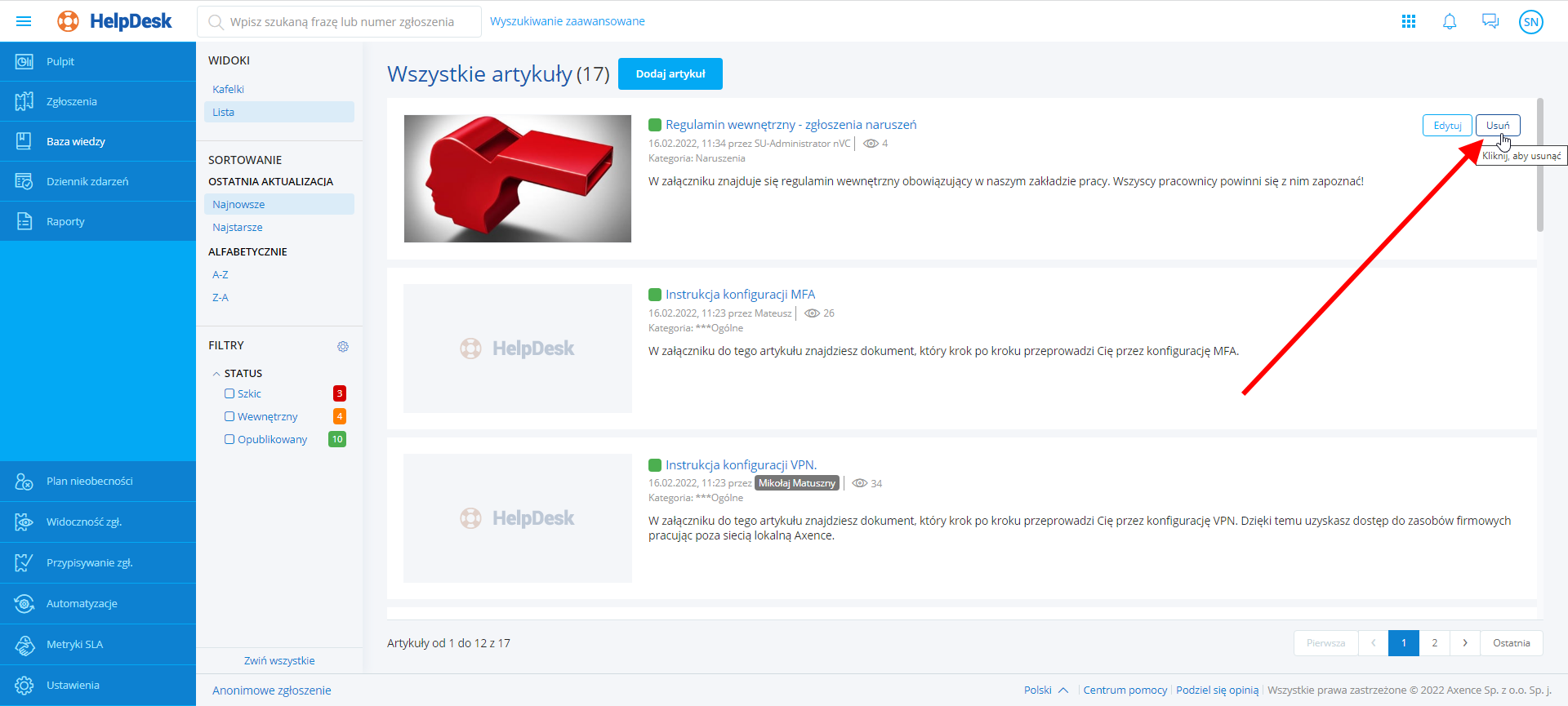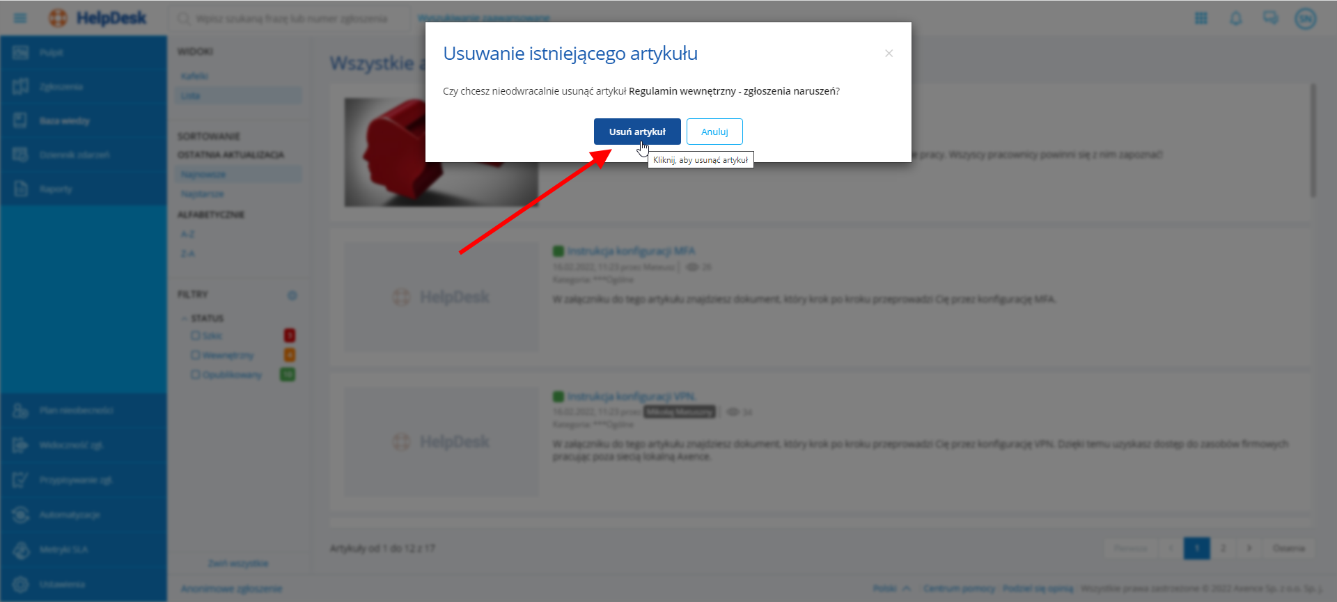 Aby usunąć artykuł w interfejsie HelpDesk: 1.W sekcji Baza wiedzy należy najechać kursorem myszy na kafelek wybranego artykułu, a następnie kliknąć w przycisk Usuń. 2.Zostanie wyświetlone okno dialogowe, w którym należy potwierdzić operację klikając w przycisk Usuń artykuł. Usunięty artykuł nie może być przywrócony.