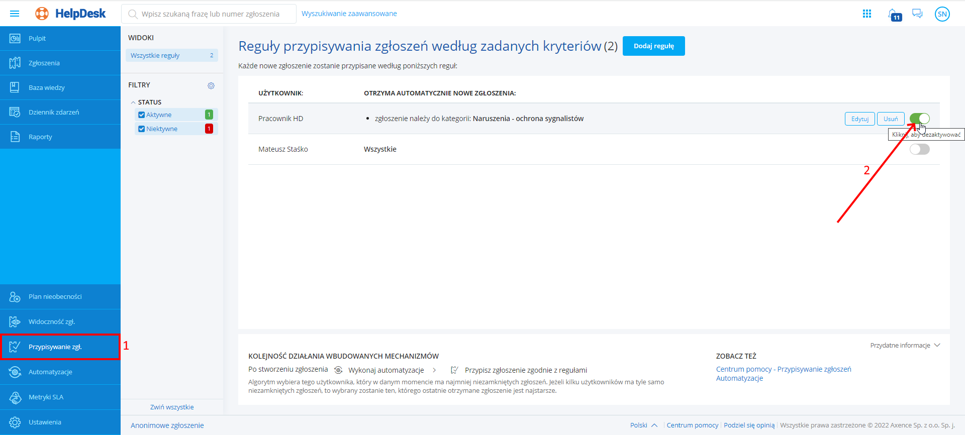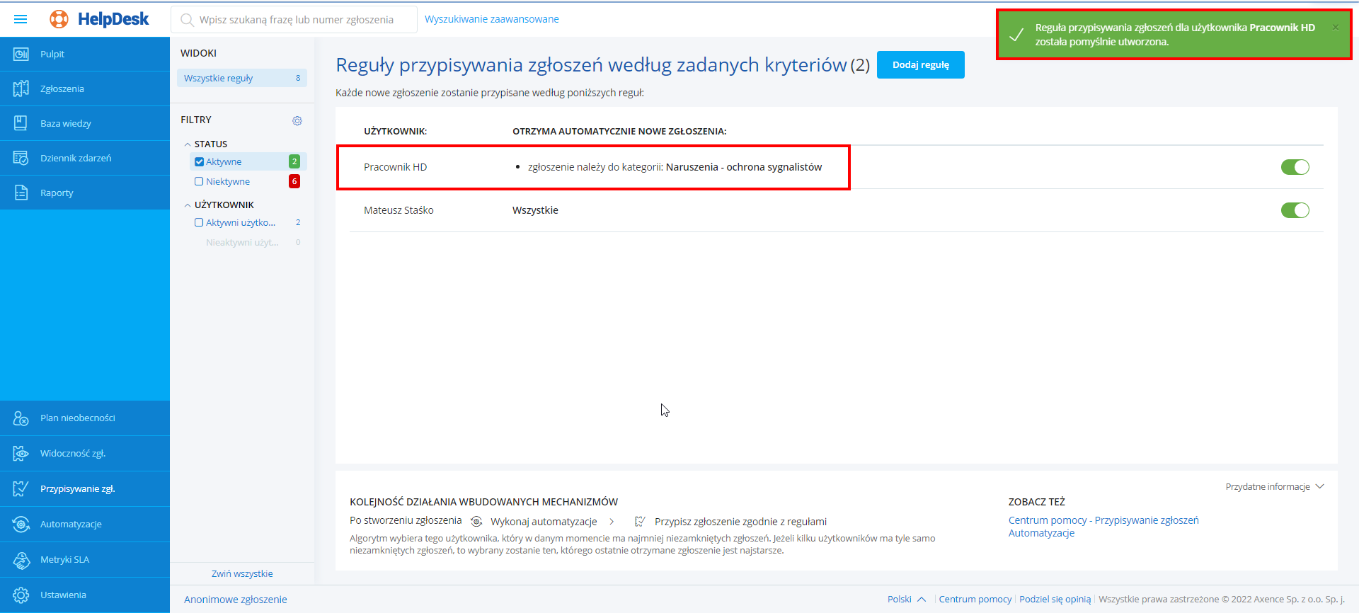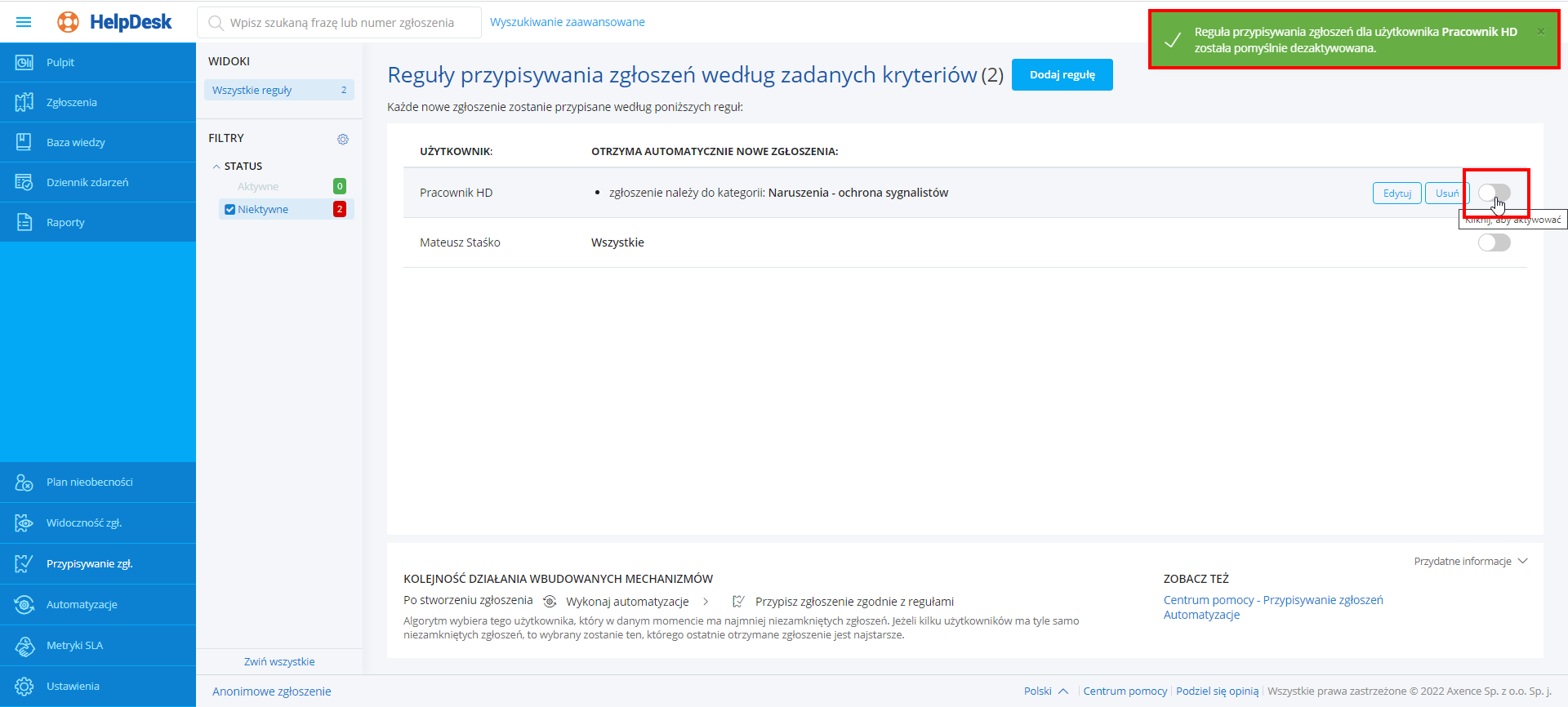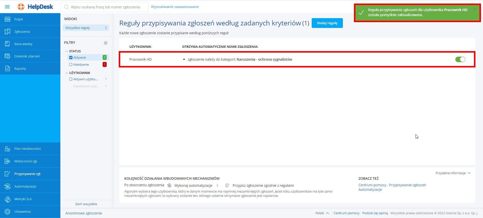 Po wykonaniu powyższych kroków, reguła zostaje aktywowana lub dezaktywowana, w prawym górnym rogu wyświetla się właściwy komunikat. Od tej pory, nowe zgłoszenia będą lub nie będą przypisywane zgodnie z regułą.