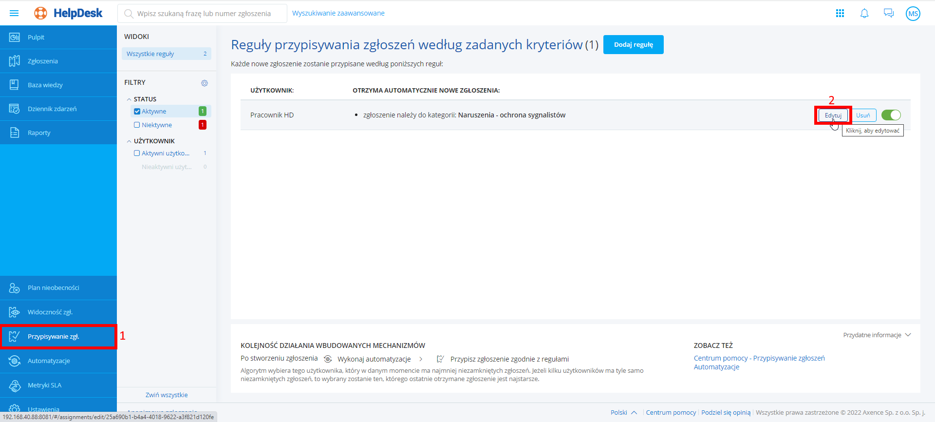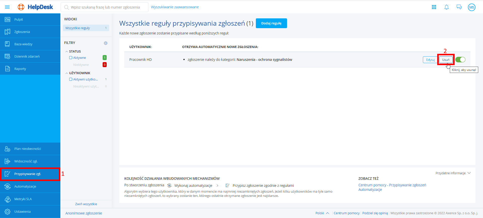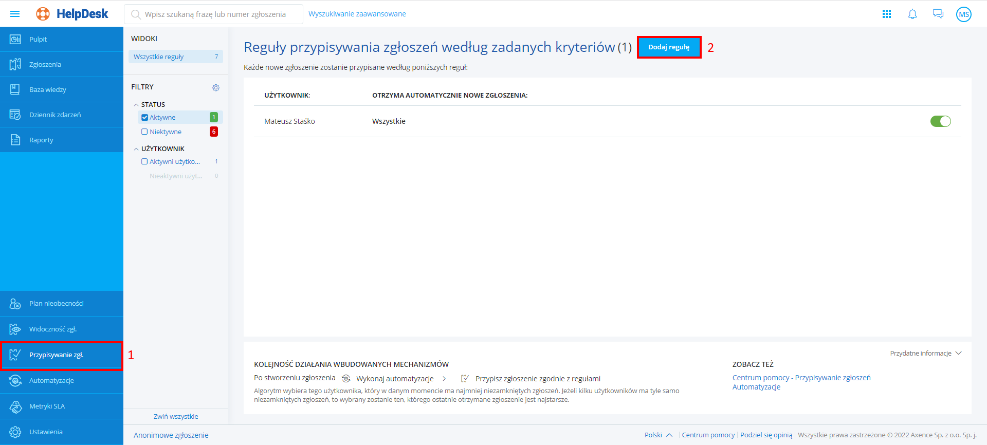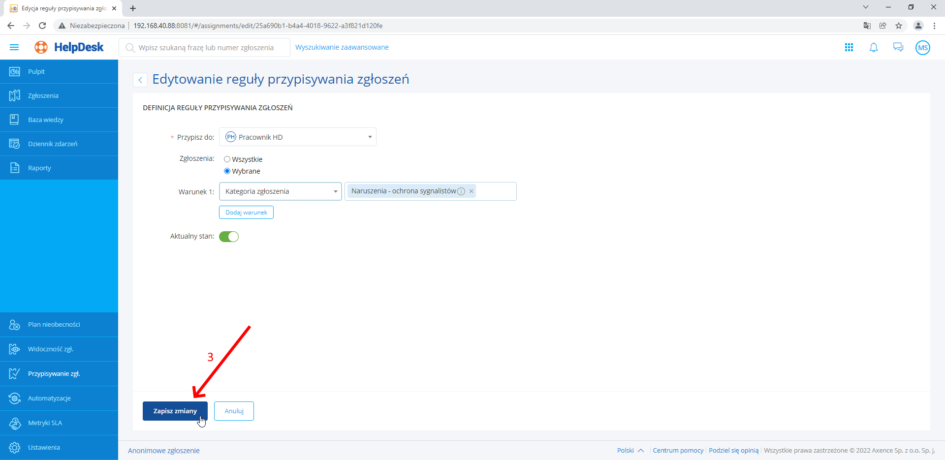 Po wykonaniu powyższych kroków, reguła zostaje aktywowana lub dezaktywowana, w prawym górnym rogu wyświetla się właściwy komunikat. Od tej pory, nowe zgłoszenia będą lub nie będą przypisywane zgodnie z regułą.