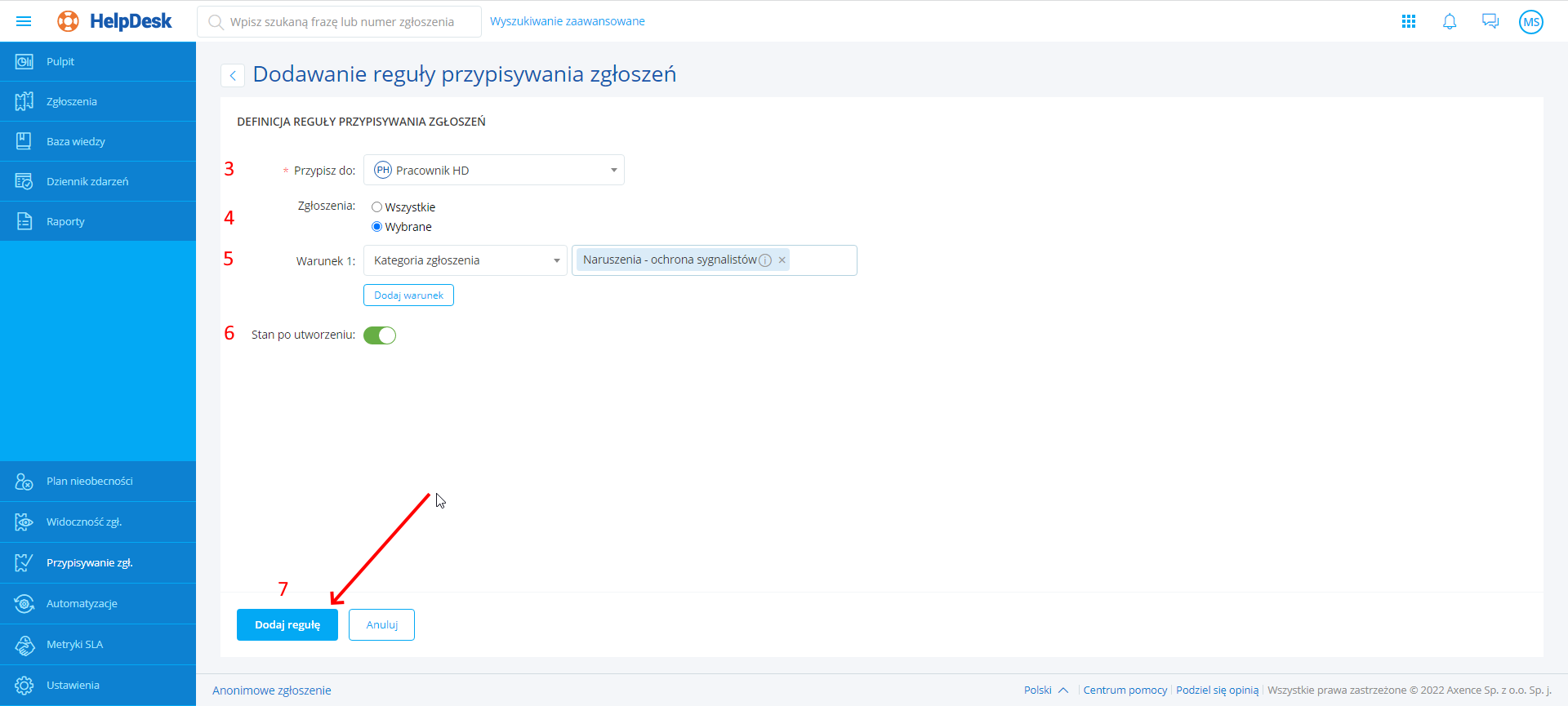 6. Jeżeli chcesz, by reguła przypisywania zgłoszenia po utworzeniu była nieaktywna, kliknij w suwak (reguła po utworzeniu jest domyślnie aktywna).
