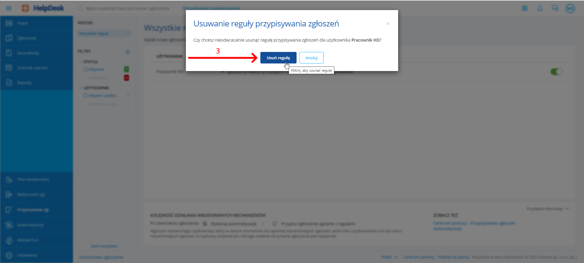 3. W oknie usuwania reguły przypisywania zgłoszeń kliknij w przycisk usuń regułę.