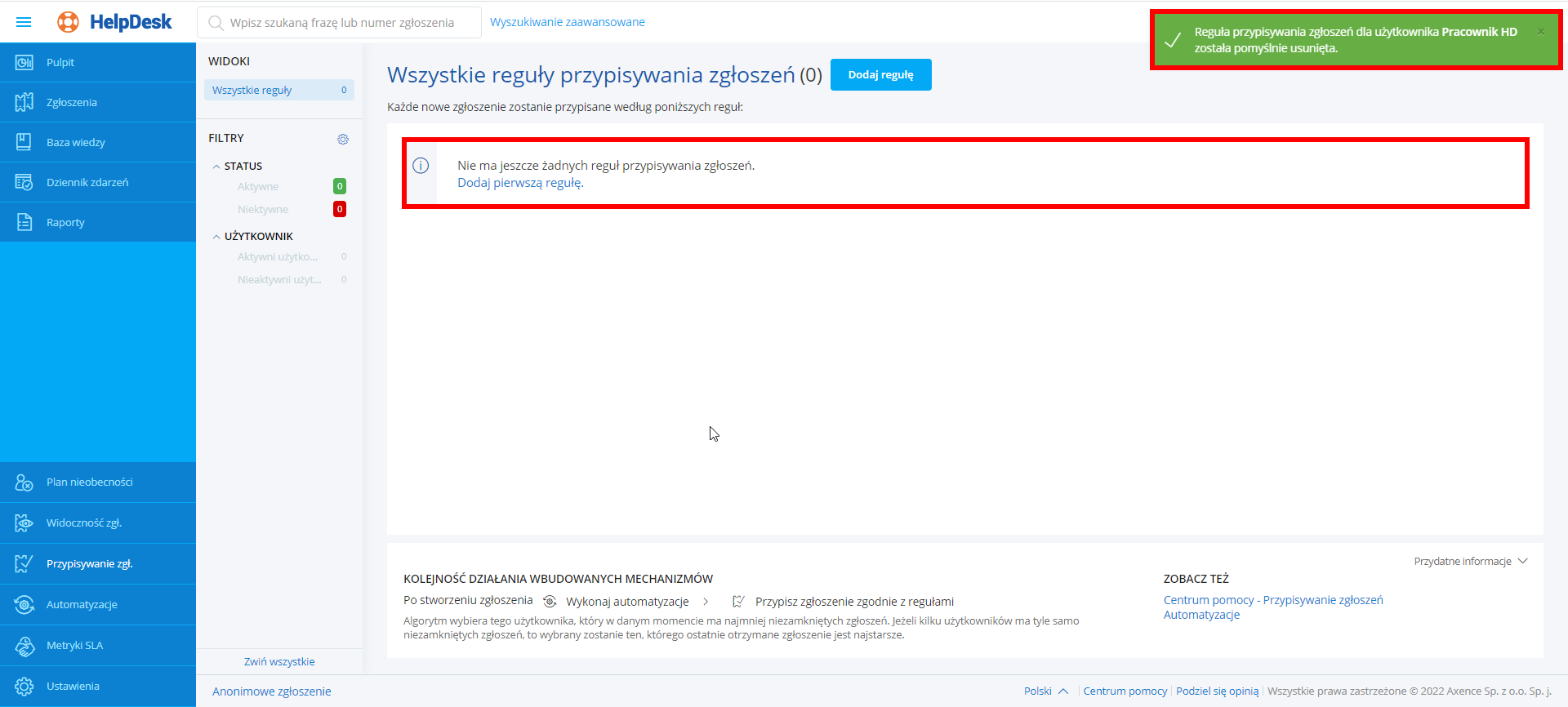 Po wykonaniu powyższych kroków, wybrana reguła przypisywania zgłoszeń zostanie trwale usunięta - w prawym górnym rogu ekranu wyświetli się odpowiedni komunikat potwierdzający pomyślne dokonanie akcji. Usunięta reguła nie będzie się wyświetlać na liście reguł przypisywania zgłoszeń.