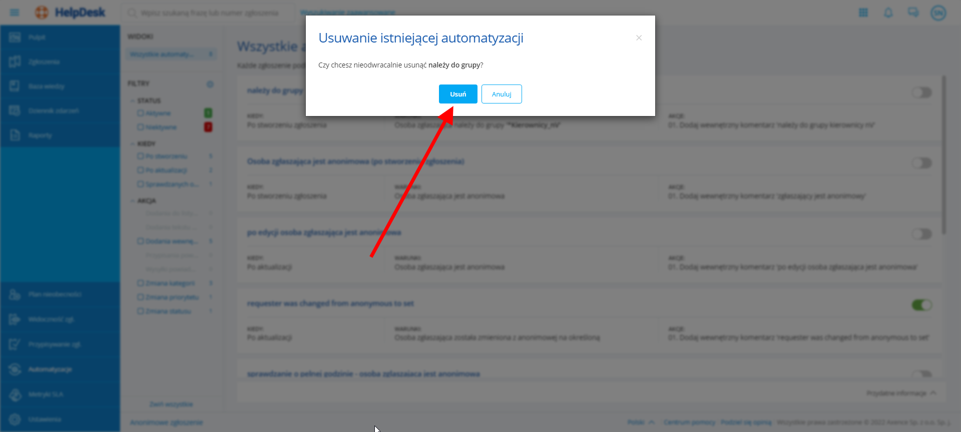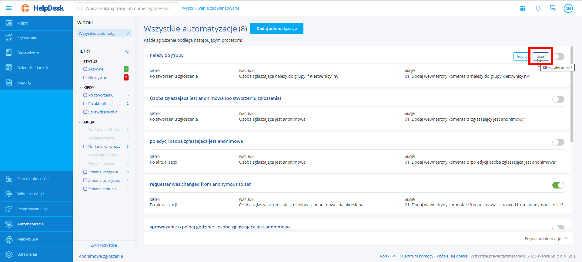 Aby usunąć regułę automatyzacji należy: 1.Zalogować się do interfejsu HelpDesk. 2.Z nawigacji głównej w lewej części interfejsu wybrać sekcję Automatyzacje. 3.Na liście automatyzacji najechać kursorem na kafelek automatyzacji, którą chcesz usunąć. 4.Kliknąć w przycisk Usuń. 5.Potwierdzić usunięcie w oknie dialogowym poprzez kliknięcie przycisku Usuń. |