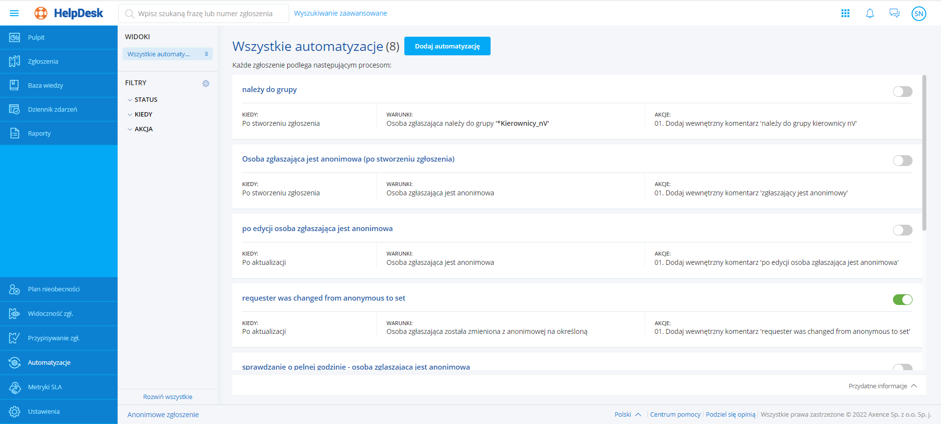 Celem automatyzacji jest odczuwalne zwiększenie szybkości realizacji zgłoszeń przez pracowników HelpDesku. W scenariuszu codziennej pracy, występują regularnie powtarzające się czynności. Występują one pod wpływem określonych warunków i wywołują zdefiniowane akcje. Czynności te mogą zostać zautomatyzowane poprzez zastosowanie reguł automatycznych. Pozwala to na zmniejszenie czasu potrzebnego na sprawne procesowanie zgłoszeń, szybszą reakcję na występujące w sieci zdarzenia i usprawnienie procesów w organizacji. Moduł HelpDesk został wyposażony w kilka wstępnie wbudowanych automatyzacji, co ma na celu wprowadzenie administratora w konstrukcję tych mechanizmów. |