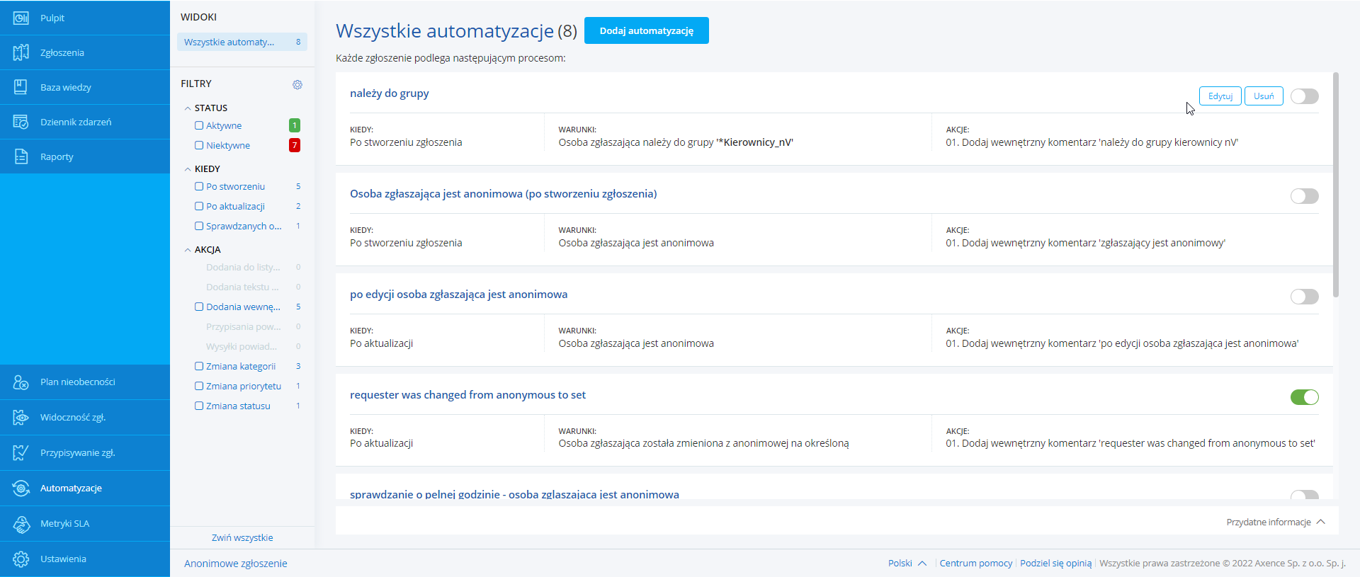 Zdefiniowane reguły automatyzacji przedstawiane są w postaci listy, która prezentuje poszczególne reguły w postaci kafelek. Pojedynczy kafelek reprezentujący określoną automatyzację zawiera: •nazwę automatyzacji, •akcje kontekstowe – pozwalają na edycję, zmianę statusu automatyzacji oraz jej usunięcie, •opis automatyzacji, •wyzwalacz automatyzacji, •listę warunków, •listę akcji. W lewej części listy automatyzacji wyświetlany jest szybki widok, który w sprawny sposób pozwala odfiltrować automatyzacje ze względu na: •status ▪aktywne ▪nieaktywne •wyzwalacz ▪wykonywane po stworzeniu zgłoszenia ▪wykonywane po aktualizacji zgłoszenia ▪wykonywane o określonej godzinie •akcje ▪dodanie do listy obserwujących ▪dodanie tekstu do tematu ▪dodanie wewnętrznego komentarza ▪dodanie publicznego komentarza ▪przypisanie powiązanego urządzenia ▪wysłanie powiadomienia przez e-mail ▪zmiana kategorii ▪zmiana priorytetu ▪zmiana statusu