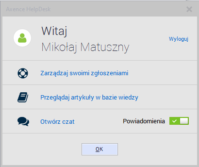 Odbieranie rozmowy – możliwe scenariusze: •Jeśli masz otwarte okno czatu z listą użytkowników, to otrzymanie wiadomości skutkuje otwarciem okna rozmowy z użytkownikiem, który wysłał tę wiadomość. •Jeśli okno jest zamknięte, ale zalogowano się z Agenta do HelpDesku, to po otrzymaniu wiadomości pojawi się informacja o otrzymaniu wiadomości. •Jeśli nie zalogowano się do HelpDesku, to wiadomość zostanie wyświetlona po najbliższym logowaniu. |