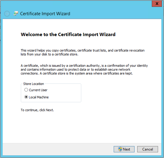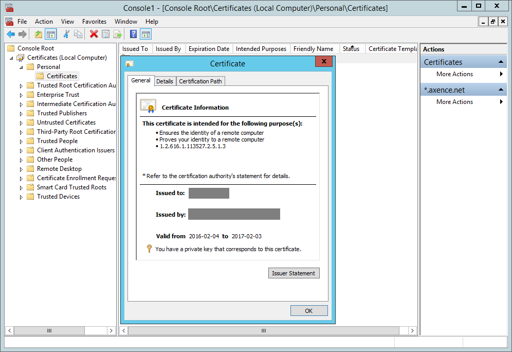 Wymagania: •Koniecznym warunkiem jest posiadanie aktualnego certyfikatu wystawionego dla domeny, pod którą dostępny będzie HelpDesk. •Certyfikat musi zawierać klucz prywatny: •Certyfikat musi zostać zainstalowany do magazynu osobistych certyfikatów komputera – serwera, na którym zainstalowany jest program Axence nVision® (System Certificate Store / Local Machine / Personal). Certyfikat zainstalowany do magazynu użytkownika nie może zostać wykorzystany do konfiguracji szyfrowanego dostępu do HelpDesku.