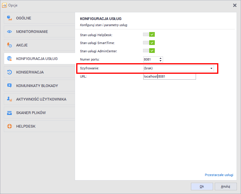 Aby skonfigurować bezpieczny dostęp do HelpDesku, przejdź do ustawień nVision i zdalnego dostępu wybierając menu: Główne - Opcje. Po wskazaniu certyfikatu, adres URL HelpDesku zostanie automatycznie zmieniony na https://FQDN:port – należy dostosować FQDN, aby odpowiadał on faktycznej nazwie DNS (na jaką został wystawiony certyfikat) – najlepiej wówczas skopiować cały URL i sprawdzić, czy otwiera się on w przeglądarce. Jeżeli taki test da pozytywny wynik, wówczas można zaakceptować okno Opcji, klikając przycisk [OK] – wprowadzony URL zostanie rozesłany do Agentów.