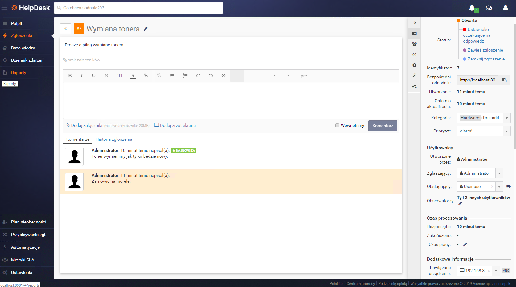 Zmiana Zgłaszającego / Obsługującego Aby ręcznie zmienić Zgłaszającego, rozwiń pole Zgłaszający i wybierz z listy właściwą osobę. Analogicznie, aby przypisać pracownika pomocy HelpDesku lub administratora do zgłoszenia, rozwiń pole Obsługujący i wybierz z listy osobę, która będzie odpowiedzialna za rozwiązanie danego zgłoszenia.