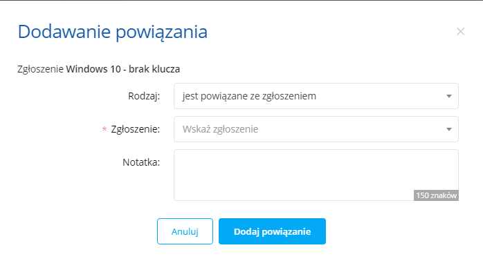 W systemie HelpDesk wyróżnia się następujące rodzaje powiązań: •Powiązanie (oba kierunki mają tę samą treść) Zgłoszenie A jest powiązane ze zgłoszeniem B. Zgłoszenie B jest powiązane ze zgłoszeniem A. •Blokowanie Zgłoszenie A blokuje zgłoszenie B. Zgłoszenie B jest blokowane przez zgłoszenie A. •Powielenie Zgłoszenie A powiela zgłoszenie B. Zgłoszenie B jest powielone przez zgłoszenie A. •Związek przyczynowo-skutkowy Zgłoszenie A jest przyczyną zgłoszenia B. Zgłoszenie B jest skutkiem zgłoszenia A. •Kontynuacja Zgłoszenie A jest kontynuacją zgłoszenia B. Zgłoszenie B jest kontynuowane przez zgłoszenie A.