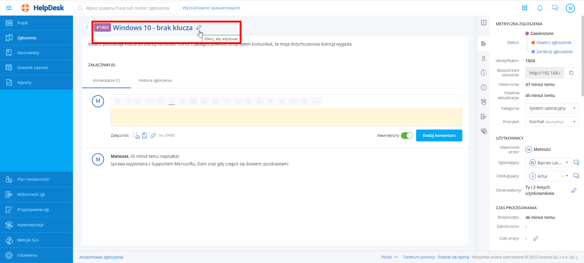Aby zmienić tytuł zgłoszenia: 1.W widoku Zgłoszenia kliknij w zgłoszenie, które chcesz przetwarzać. 2.Najedź kursorem myszy na tytuł zgłoszenia, a następnie kliknij w ikonę ołówka znajdującą się obok tematu zgłoszenia. 3.W oknie dialogowym wpisz nowy tytuł zgłoszenia. 4.Kliknij w przycisk Zapisz zmiany.