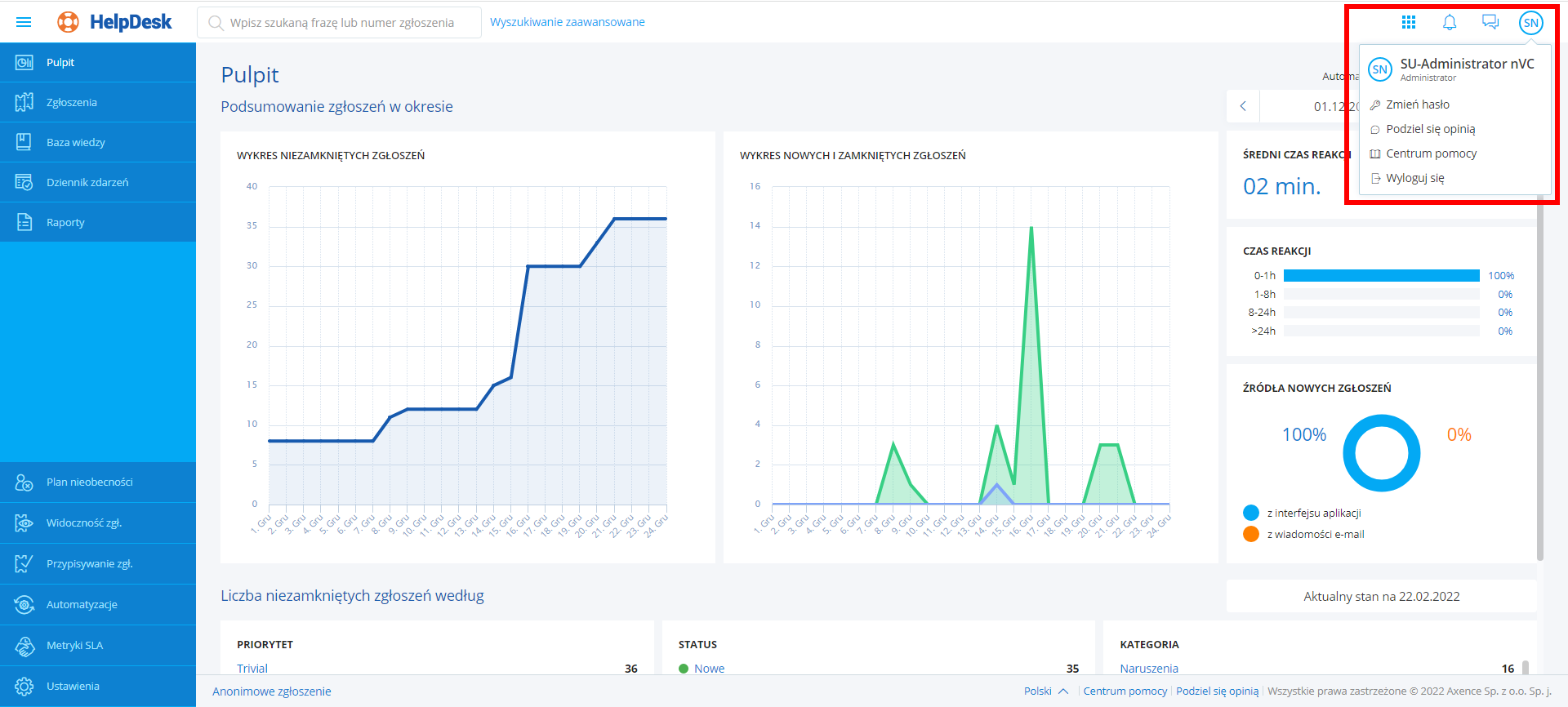 Strefa użytkownika to obszar w prawym górnym rogu interfejsu HelpDesk. Znajduje się tu awatar użytkownika oraz dodatkowe informacje i akcje, które może wykonać zalogowany użytkownik.