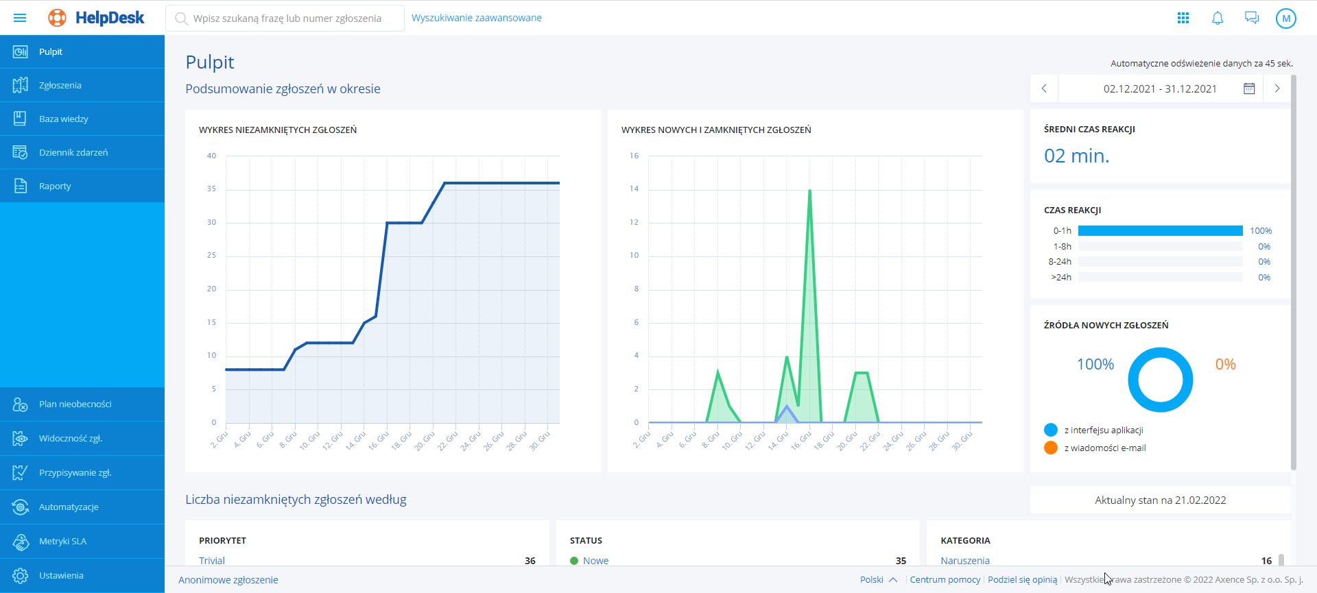 Widoki główne modułu HelpDesk to dziesięć sekcji, do których można przejść, korzystając z nawigacji głównej zlokalizowanej po lewej stronie interfejsu. Należy pamiętać, że jedynie użytkownik o roli Administrator w HelpDesku posiada nieograniczony dostęp do wszystkich sekcji HelpDesku. Zarówno Użytkownik jak i Pracownik HelpDesku nie mają dostępu do niektórych z sekcji HelpDesku. •Pulpit Pulpit zawiera podstawowe statystki dotyczące przetwarzanych zgłoszeń, takie jak: średni czas reakcji, informacje o źródłach nowych zgłoszeń, liczbę zgłoszeń z podziałem według priorytetu/statusu/kategorii. Prezentowane są również wykresy: •Wykres niezamkniętych zgłoszeń •Wykres nowych i zamkniętych zgłoszeń
