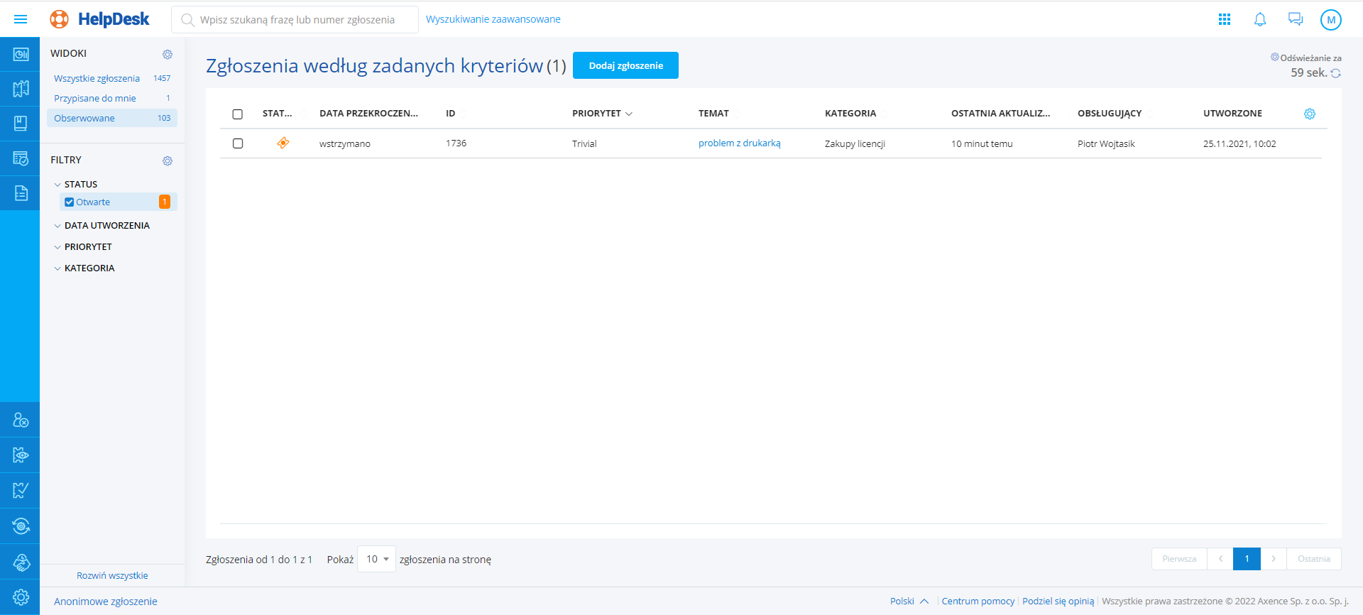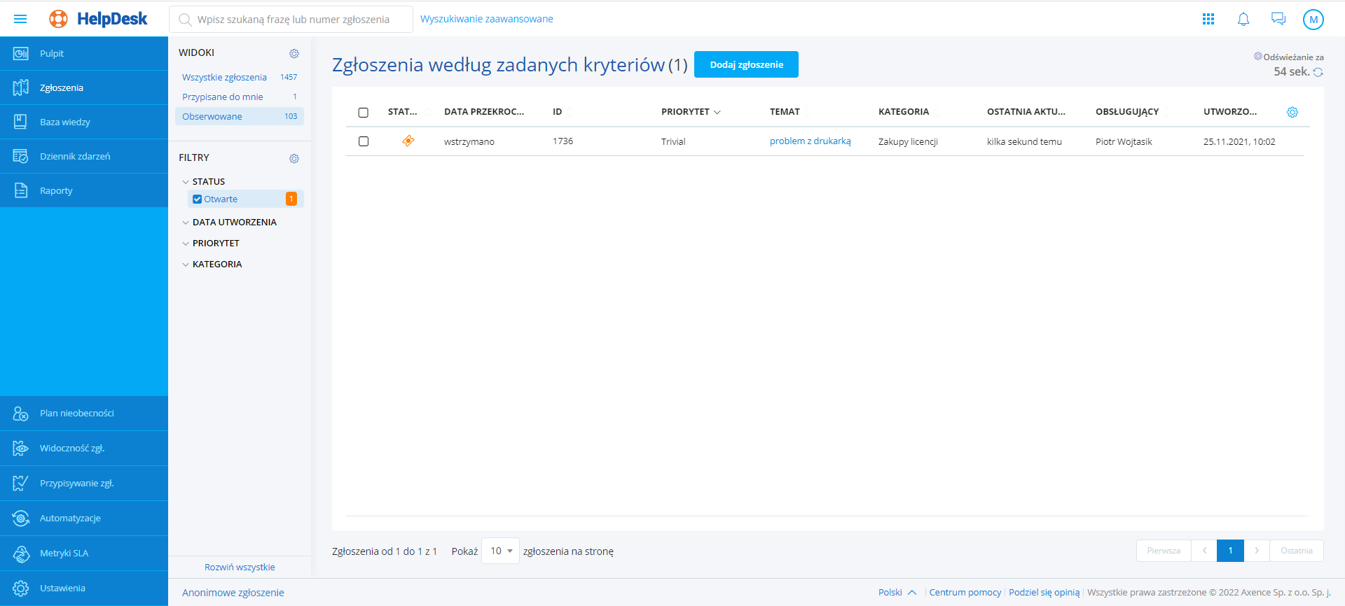 •Ustawienia (Kategorie, Formularze zgłoszeń, Priorytety, Powiadomienia, Sygnaliści)