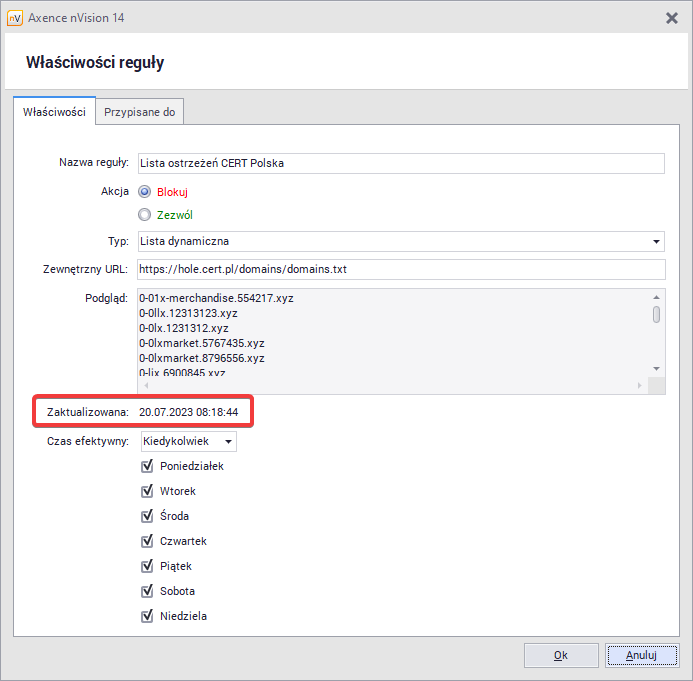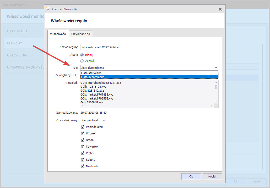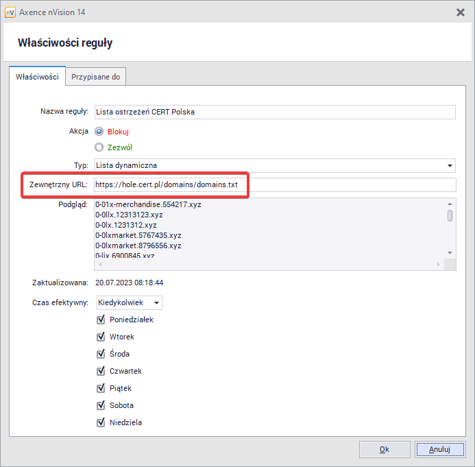 Dodaj i przypisz regułę Podczas tworzenia reguły podaj jej nazwę, wybierz akcję Blokuj i podaj adres IP lub domenę, którą chcesz zablokować. Wprowadź każdą domenę / IP w nowej linii. W Domenie / IP można używać znaku „*“, który oznacza dopasowanie dowolnego ciągu znaków. Lista reguł filtrowania WWW może być kopiowana pomiędzy grupami użytkowników. Przykład reguły pokazany jest na poniższym rysunku. W opcjach nVision możesz skonfigurować tekst powiadomienia, które zostanie wyświetlone użytkownikowi, gdy odwiedzi zablokowaną stronę. Reguły są współdzielone między Atlasem, grupami a kontami użytkowników.