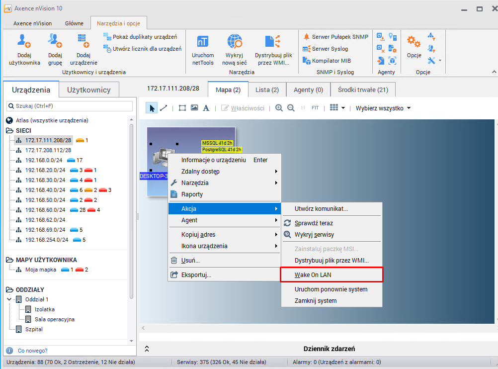 Aby wybudzić monitorowane urządzenie, wykonaj jedno z poniższych: 1.W widoku mapy lub urządzeń w głównym oknie nVision kliknij prawym przyciskiem myszy w urządzenie i wybierz opcję Wake On LAN.