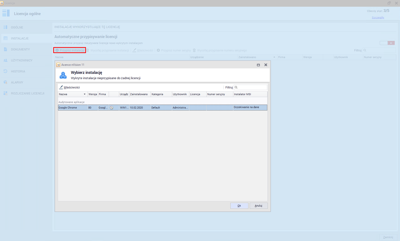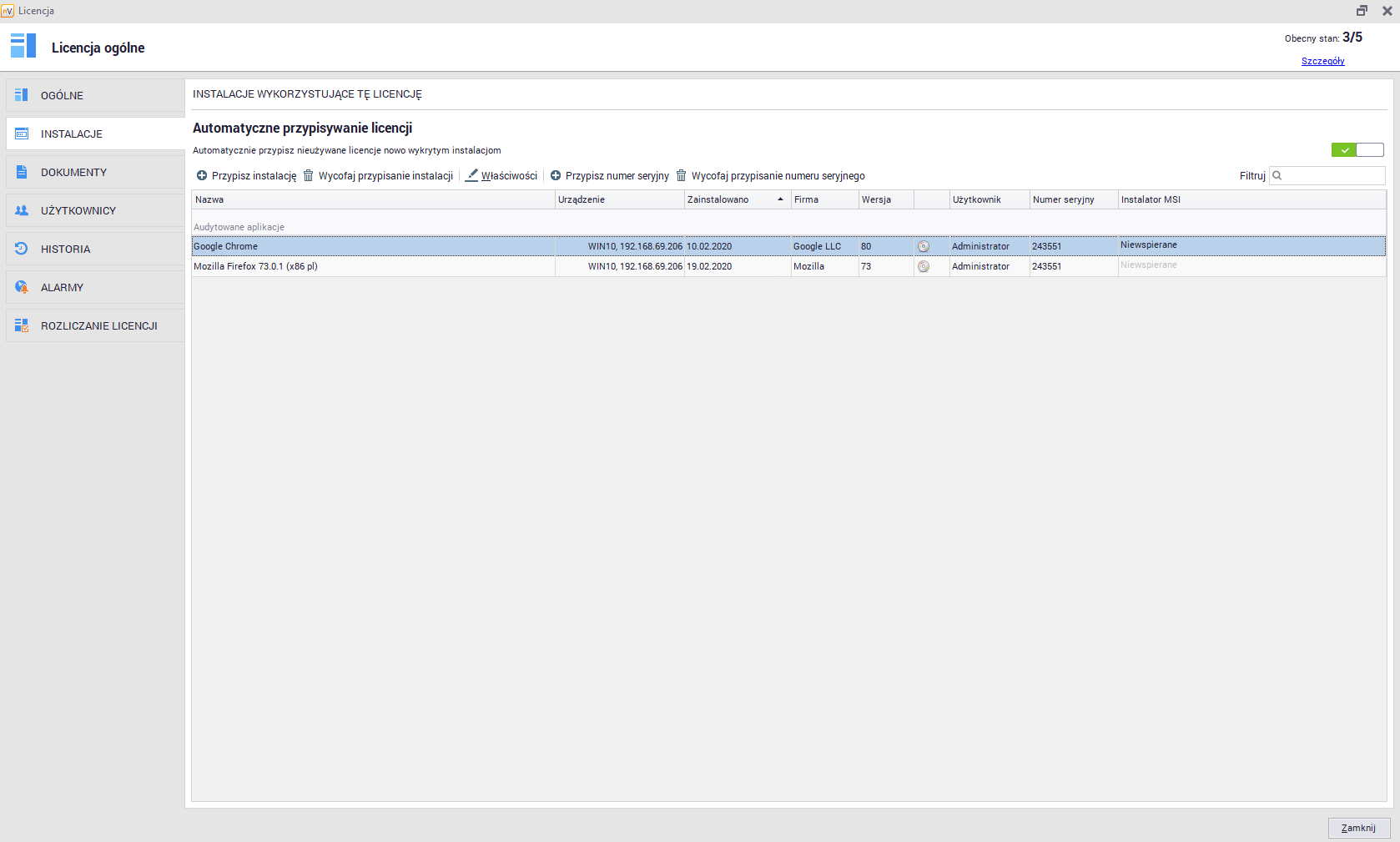 Okno to zostało opisane w rozdziale Instalacje aplikacji. Automatyczne przypisywanie licencji W górnej części okna zakładki instalacji dostępny jest przełącznik, który pozwala na automatyczne przypisanie licencji do nowo wykrytych instalacji. Włączenie go pozwoli na automatyczne dodanie kolejnych pozycji na liście instalacji w momencie ich wykrycia.