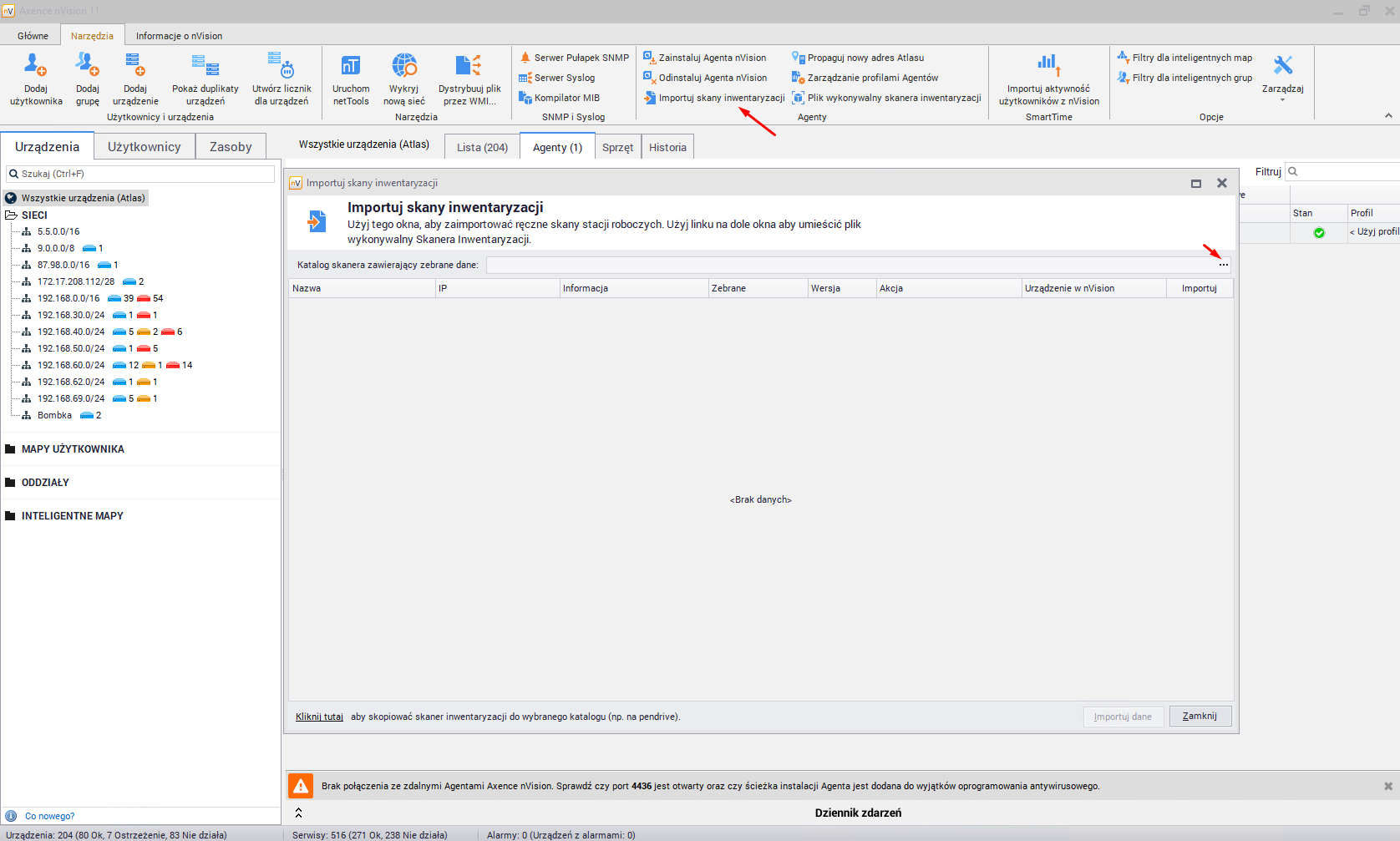 2.Wykonaj skan inwentaryzacji. Jeśli będziesz kopiować skaner do innej lokalizacji, to zadbaj o skopiowanie obu plików skanera (nVision_InventoryScanner.exe oraz nVision_InventoryScanner.config). Uruchom plik wykonywalny skanera inwentaryzacji (nVision_InventoryScanner.exe) na komputerze, który ma być skanowany, aby rozpocząć proces skanowania. 3.Importuj dane a.Po zakończeniu skanowania, skopiuj utworzone foldery (Data oraz Logs) do lokalizacji, która będzie widoczna z poziomu konsoli nVision. b.W oknie importowania skanów inwentaryzacji (Importuj skany inwentaryzacji w zakładce Narzędzia) wybierz folder, w którym znajdują się skany (czyli skopiowany wcześniej folder Data).