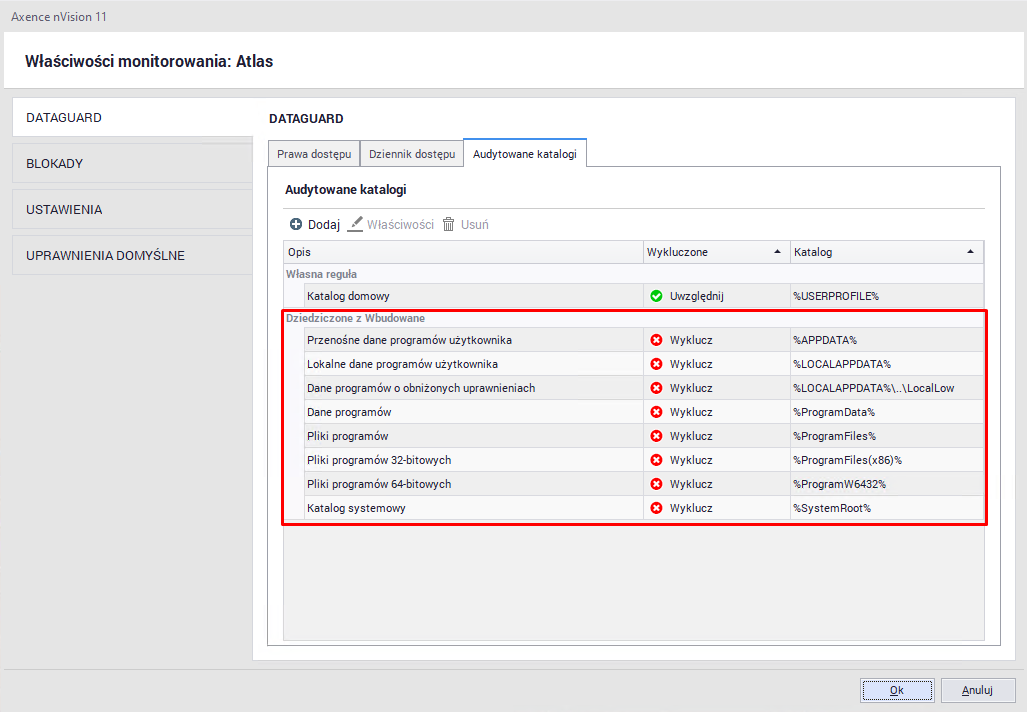 Ustawienia monitorowania katalogów lokalnych można zdefiniować dla Atlasu (wszystkich użytkowników), grup użytkowników oraz dla poszczególnych osób. Można je znaleźć w kilku miejscach: 1.Okno Użytkownicy / Informacje o Atlasie / DataGuard / Audytowane ścieżki: