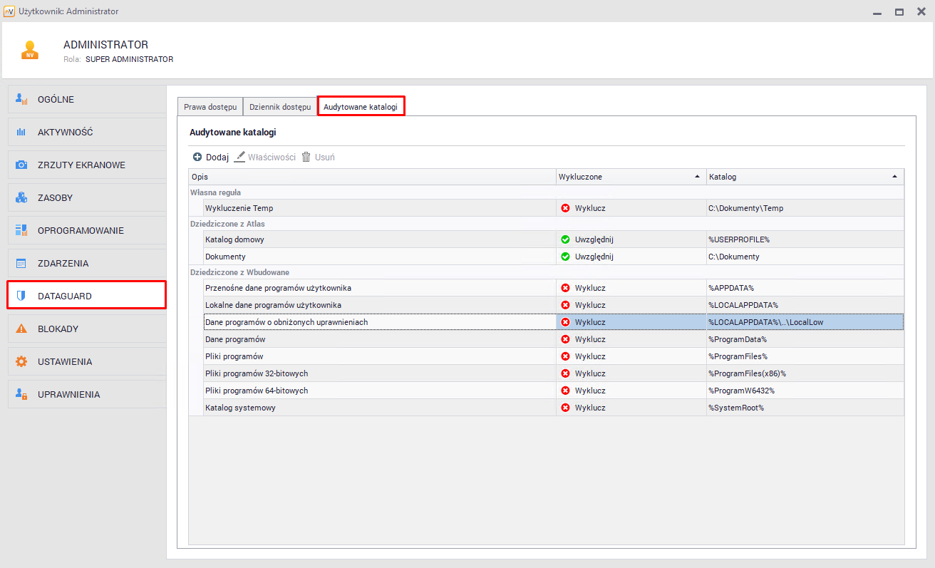 Dla każdego użytkownika można dodać także katalogi wykluczone z audytowania (wyjątki). Oznacza to, że w przypadku konkretnego użytkownika operacje w wybranym katalogu nie będą monitorowane. Ustawienia te można nadawać tylko z poziomu okna ustawień modułu DataGuard dla konkretnego użytkownika: