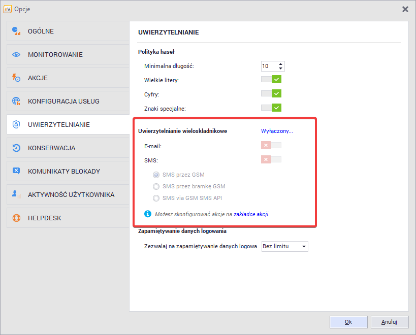 Od wersji 14.5, nVision umożliwia włączenie lub wyłączenie opcji zapamiętywania danych do logowania. Ustawienie to jest globalne i dotyczy wszystkich użytkowników logujących się do konsoli nVision, bez żadnych wyjątków.