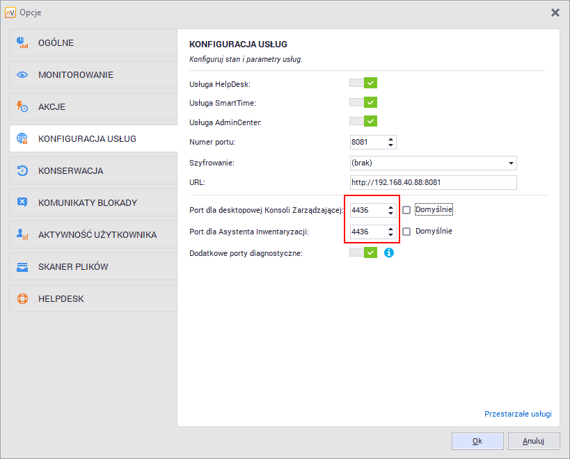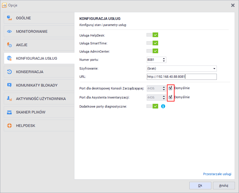 Aby zmienić port, należy: 1.Na wstążce wybrać kartę Główne, a następnie kliknąć w Opcje. 2.Przejść do zakładki Konfiguracja usług 3.Odznaczyć opcję Domyślnie przy porcie dla desktopowej Konsoli Zarządzającej lub przy porcie dla Asystenta Inwentaryzacji, a następnie ręcznie ustawić port. |