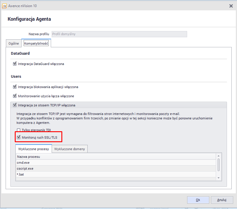 W przypadku gdy poczta używa szyfrowania SSL/TLS, należy w profilu agenta zaznaczyć odpowiednią opcję, aby korespondencja była monitorowana: |