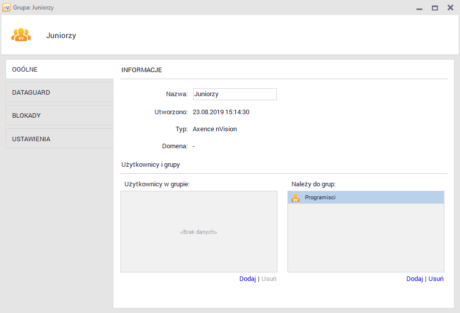 Przy tak ustawionych prawach możliwe jest czytanie plików znajdujących się na nośnikach zewnętrznych, natomiast blokuje się możliwość zapisywania danych oraz uruchamiania plików wykonywalnych. Włączenie audytu skutkuje monitorowaniem działań użytkowników związanych z nośnikami zewnętrznymi, czyli daje informacje o czytanych plikach, a także o próbach zapisu i uruchomienia. Podłączenie i odłączenie urządzenia monitorowane jest zawsze, niezależnie od ustawienia opcji audytu. Tworzenie grupy użytkowników korzystających z firmowego pendrive'aJeśli pendrive firmowy dostępny jest dla pewnego działu lub grupy użytkowników, zaleca się utworzenie grupy umożliwiającej łatwe zarządzanie prawami dostępu dla tych użytkowników. Aby utworzyć grupę: 1.Kliknij na wybranej grupie lub folderze prawym przyciskiem myszy, a następnie wybierz opcje Nowy / Grupa.