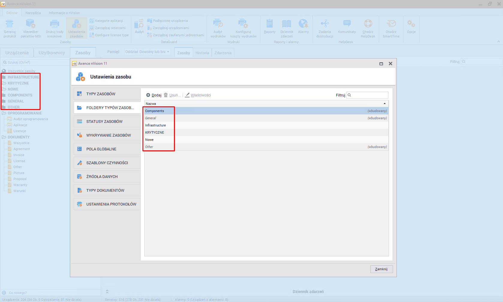 Wbudowane foldery Początkowo program posiada kilka wbudowanych folderów dla typów zasobów. Należą do nich: •Podstawowe (wbudowane), •Podzespoły (wbudowane), •Urządzenia infrastruktury, •Urządzenia przenośne, •Inne (wbudowane).