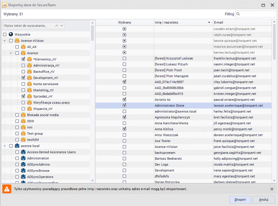 Następnie w oknie "Eksportuj dane do SecureTeam" wskaż wybranych użytkowników, lub grupy użytkowników, zaznaczając odpowiednie checkboxy.