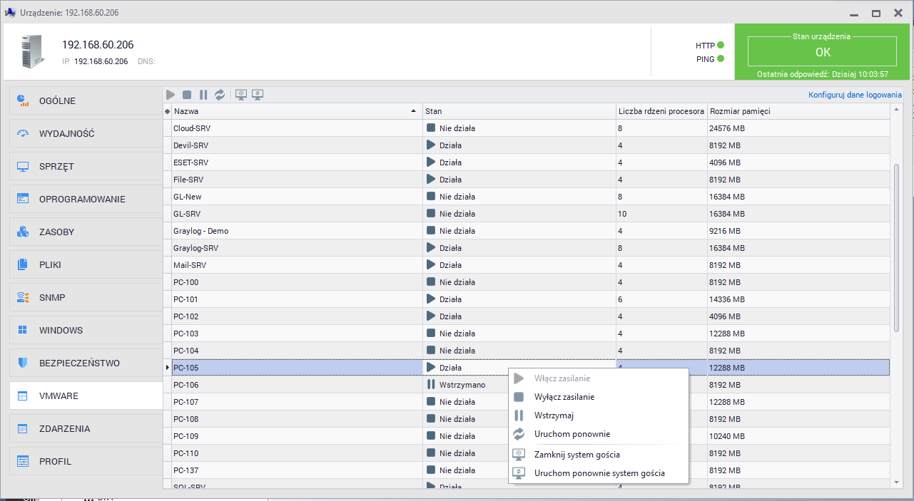 W nVision 14.5 wprowadzono funkcjonalność pozwalającą na zarządzanie maszynami wirtualnymi VMware.